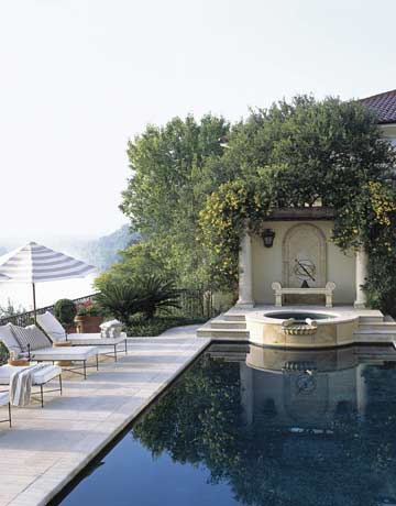 The pool and pergola overlook Lady Bird Lake. Umbrellas are from Crate & Barrel. Amalfi lounge chairs by Janus et Cie.