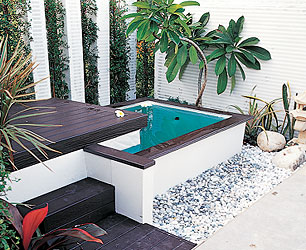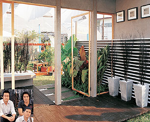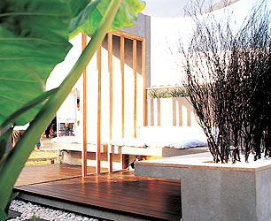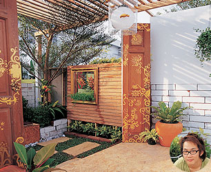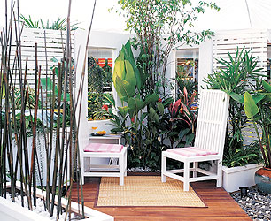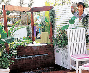 ใช้รูปแบบของงานตกแต่งภายในมาเป็นจุดเด่นในการจัดสวน โดยนำเสนอแนวคิดที่ว่าให้สวนเป็นเสมือนห้อง ๆหนึ่งของบ้าน เน้นการออกแบบโดยใช้เส้นทแยง ทำให้พื้นที่ดูมีสเปซมากขึ้น ส่วนผนังใช้หน้าต่างทรงยาว และไม้ระแนงทำให้ดูโปร่งโล่ง ขณะที่ผนังส่วนหนึ่งทำเป็นม่านน้ำตกไหลลงมาสร้างเสียงและความสดชื่นในสวน