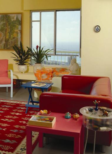 חלל הסלון פונה אל הנוף ששימש השראה לצבעוניות. הפתחים שחודשו והותקנו במסגרות אלומיניום בלגי טבעי, הריצוף שנעשה באריחי גרניט פורצלן אפורים והמבניות הנקייה יוצרים מסגרת מעודנת, האוצרת בתוכה את הצבעוניות העזה ללא כל תחושה תזזיתית או עמוסה. שטח החלל נחלק לפינות אוכל וישיבה, ועיצובו האקלקטי שנרקם על בסיס תכנים אישיים ואהבת הצבע של בעלת הבית משלב פריטי ריהוט ישנים וחדשים לצד אוספים ייחודיים. ריצוף: "מודי".