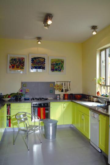 כך, למשל, לצד הגוון הצהוב שמקבל את פני הבאים כבר בדלת הכניסה, דלתות הפנים שהן הדלתות המקוריות של הדירה נצבעו בגון ירוק, ששולט גם בעיצובו של המטבח המרווח. חללו תוכנן בתצורת האות ח' עם יחידות תחתונות בלבד עשויות מ.ד.פ. צבוע בתנור והקיר חופה בטיח, כאשר מעל הכיריים שולבו בו אריחי הריצוף ובתוכם כפרט דקורטיבי שובצו מסגרות קרמיקה חינניות של האמנית רחל צמיר.