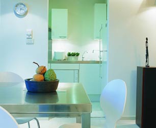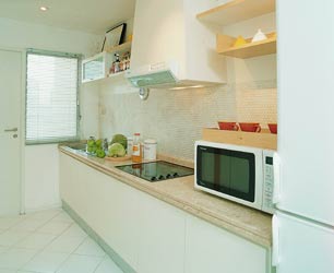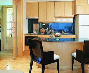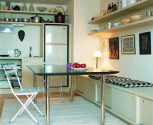 ครัวในอาคารชุด ซึ่งโดยส่วนใหญ่มีเนื้อที่จำกัด ดังนั้นจึงจัดให้ครัวและส่วนรับประทานอาหารมีพื้นที่เปิดโล่งต่อเนื่องถึงกัน เพื่อให้สามารถใช้พื้นที่ได้อย่างคุ้มค่า แต่อย่างไรก็ดี ในการทำอาหารต้องวางแผนให้รัดกุมว่าอาหารที่ทำเป็นประจำนั้นมีกลิ่นและควันรุนแรงหรือไม่เพราะจะทำให้ครัวและห้องชุดทั้งห้องมีกลิ่นไม่พึงประสงค์ได้ แม้จะมีเครื่องระบายอากาศช่วย การทำที่นั่งรับประทานเป็นแบบบิลท์อิน ด้านล่างเป็นตู้เก็บของ การทำชั้นวางของที่ผนังเป็นการใช้ประโยชน์พื้นที่ที่มีอย่างจำกัดได้อย่างคุ้มค่า