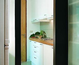 แพนทรี่ขนาดเล็กในห้องชุด มีประตูเลื่อน กรอบอะลูมิเนียมสีดำกรุกระจกใส เพื่อกั้นไม่ให้ควันออกมารบกวนห้องอื่นๆ ชุดครัวสีอ่อนทำให้พื้นที่ขนาดเล็กดูไม่แคบ