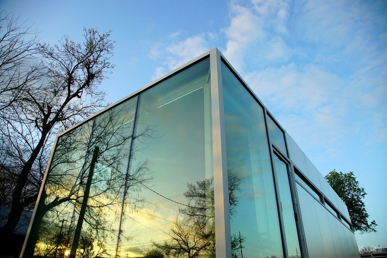 The glass cube at the front of the home brings in natural daylight throughout the entire unit.