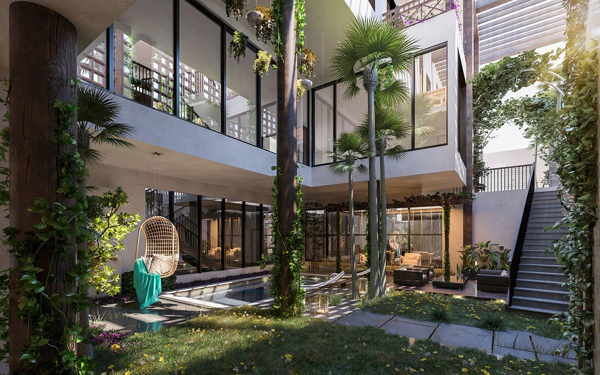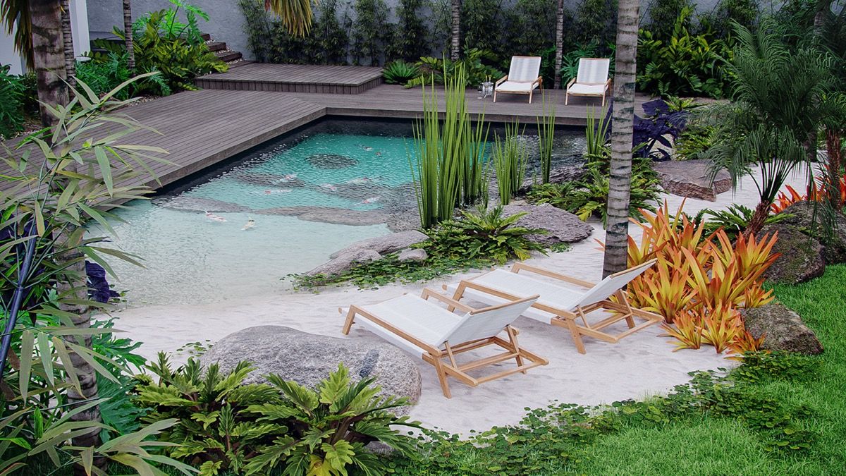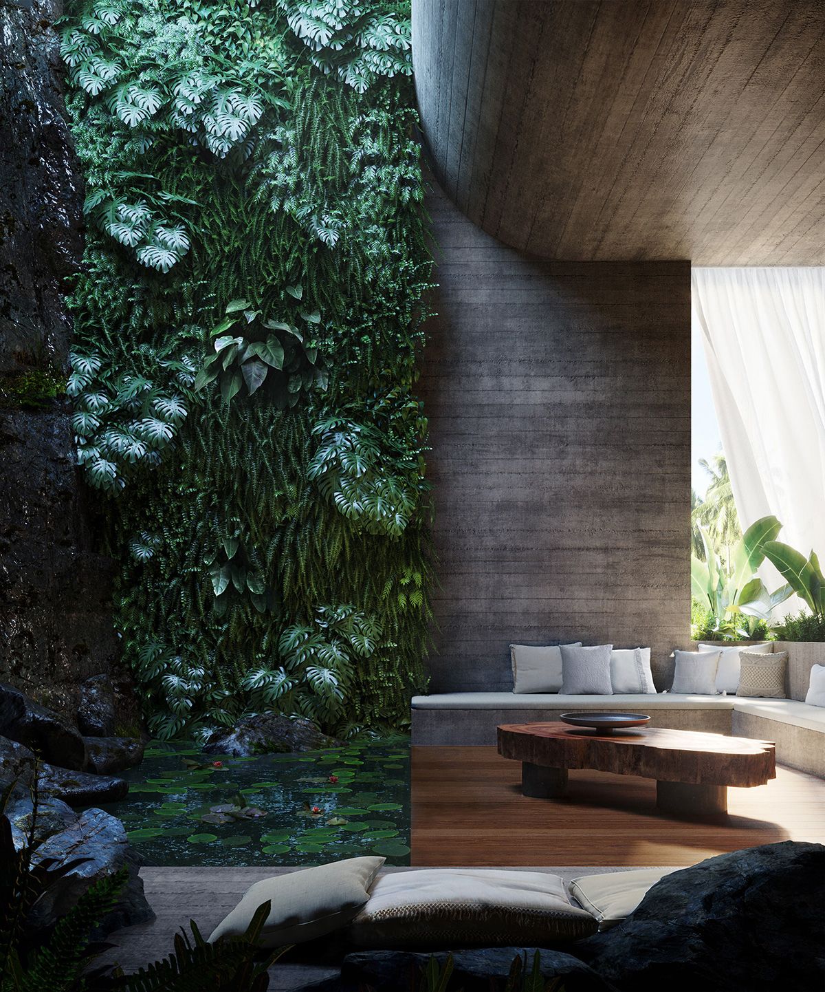 When space is tight, make poolside magic with a vertical garden over a pond of lily pads. A live edge coffee table and natural seating upholstery will complement the drape of natural textures.