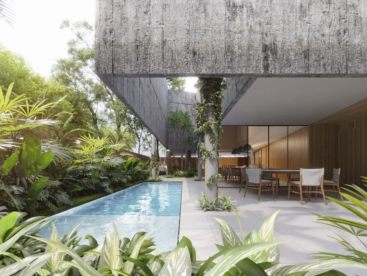 A plethora of tropical plants offset this cold brutalist house exterior. Mature shrubs loll poolside, whilst vines envelop concrete columns around an outdoor dining area.