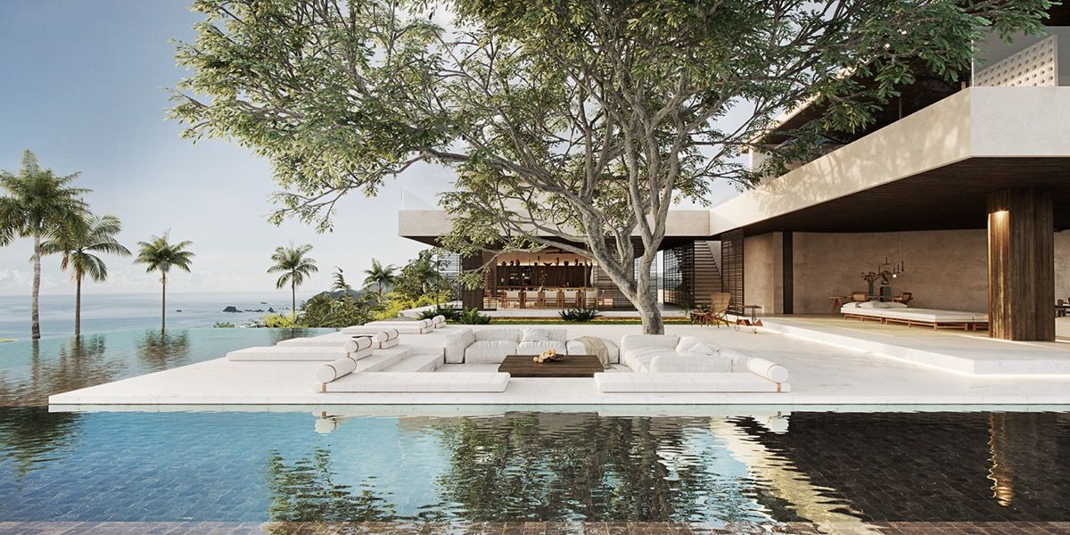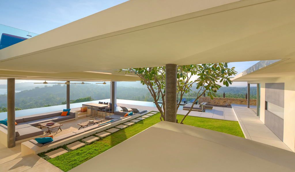 A cosy conversation pit beds down beneath the outstretched boughs of a majestic evergreen at this stunning Indonesian luxury villa. Chic modern sun loungers meld with the crisp white concrete terrace.