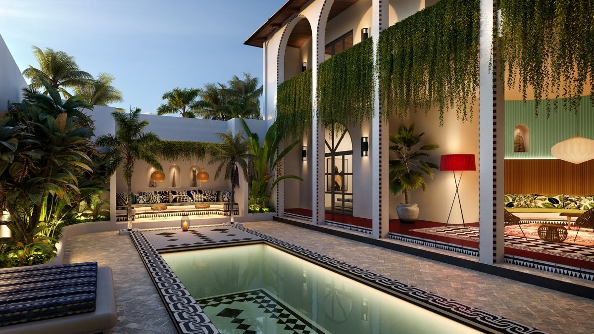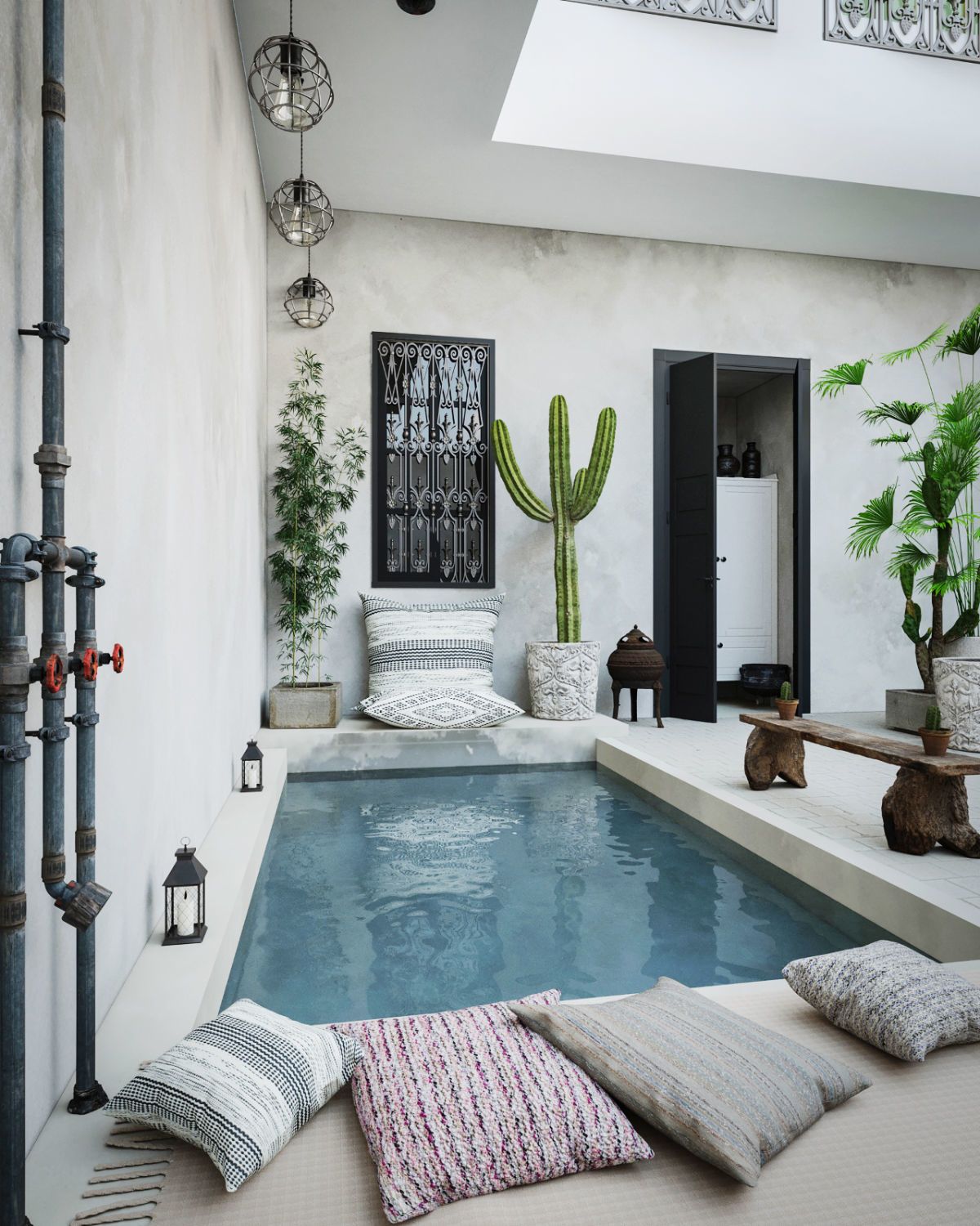 Patterned tiles build a moroccan design around this stunning swimming pool and home exterior.