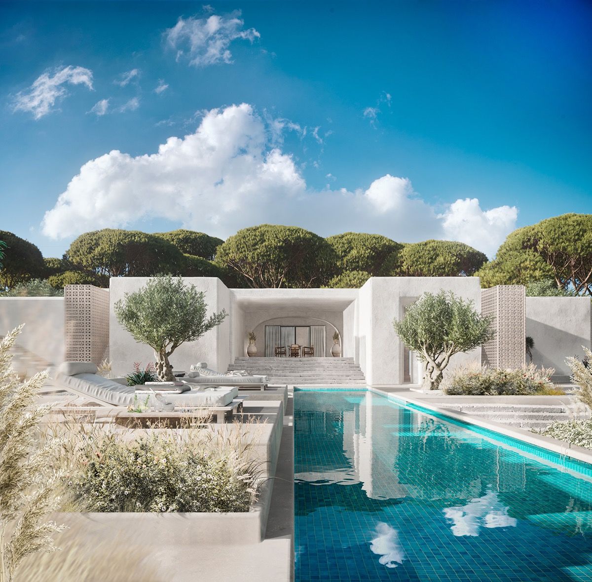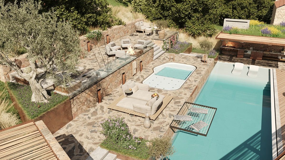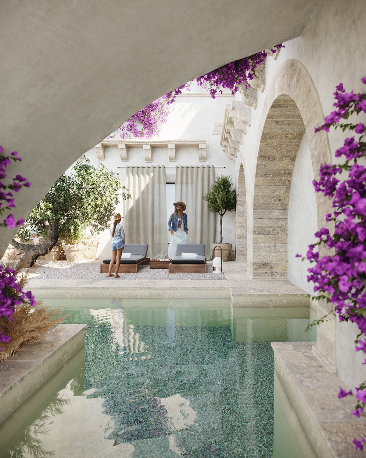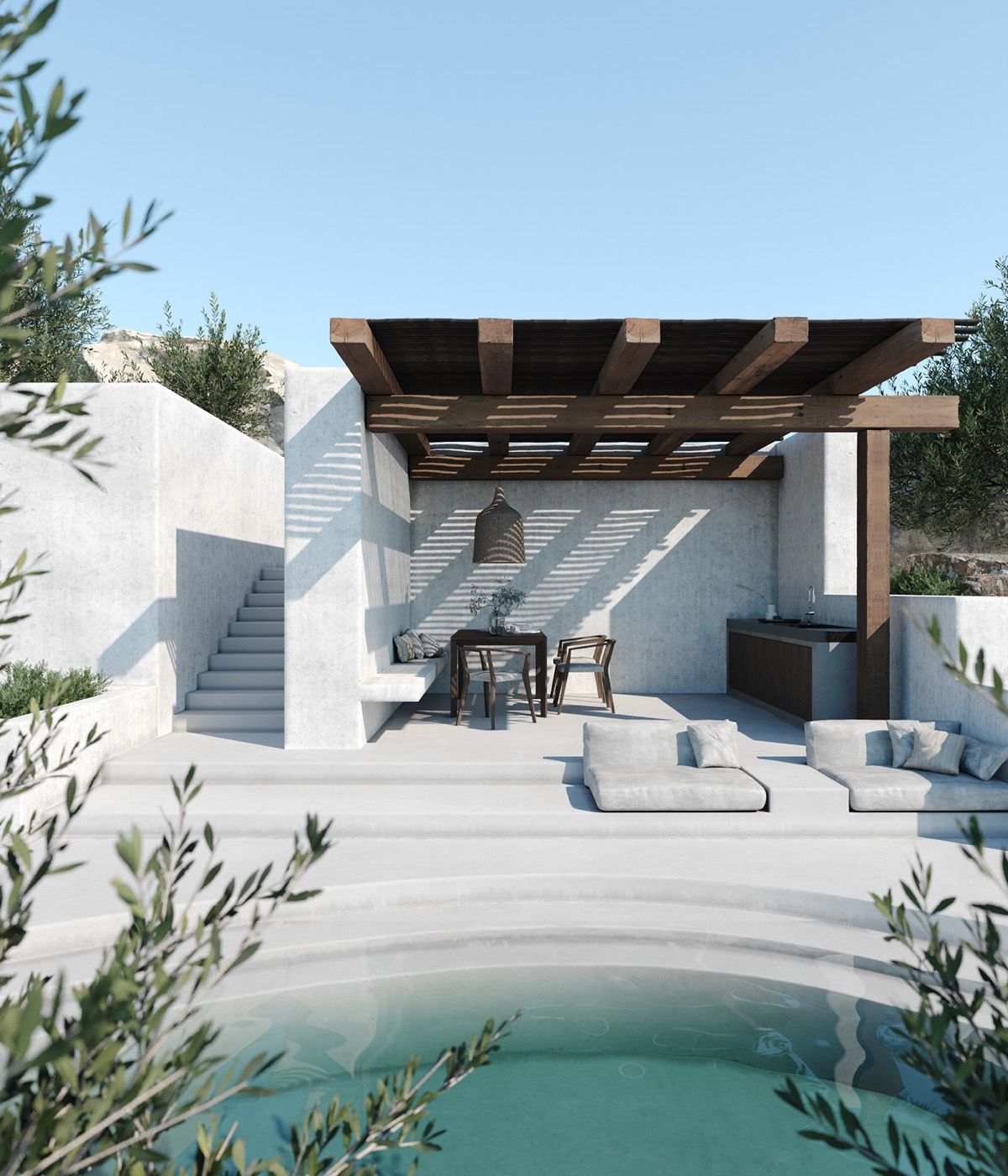 Domed treetops and arched architecture frame a small dining area at the top of this poolside setting. Sun Loungers pull in between olive trees and integrated planters.