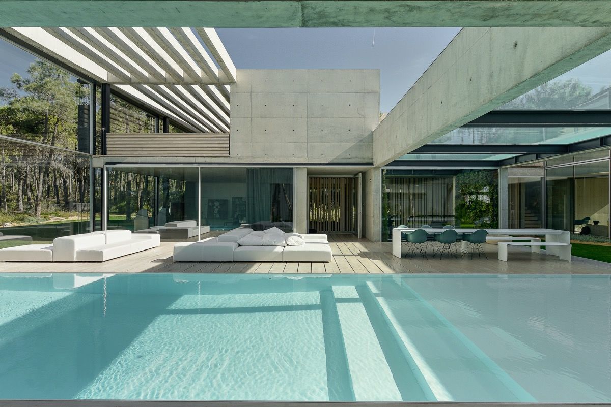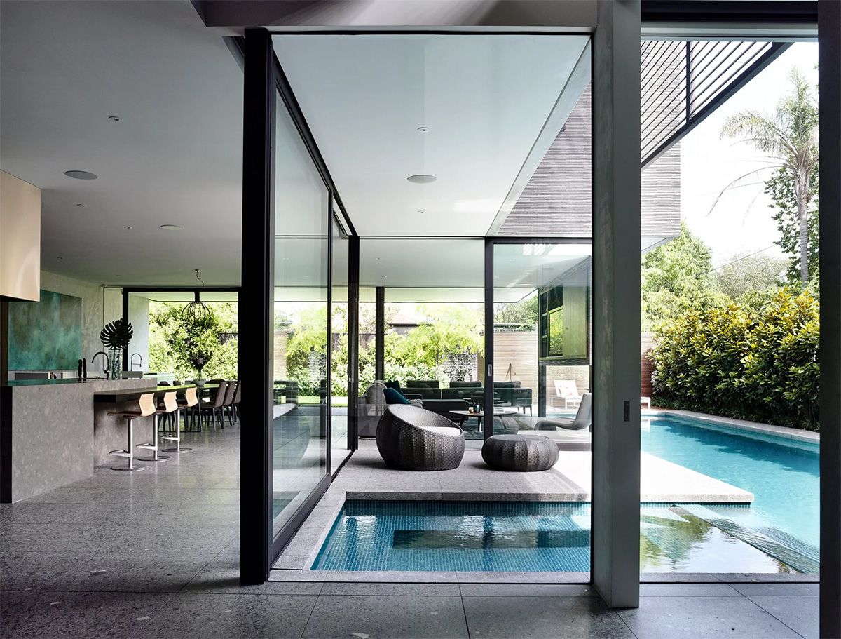 An outdoor chair with ottoman set makes a solitary moment for poolside relaxation here, until retractable doors open up the neighbouring living room.