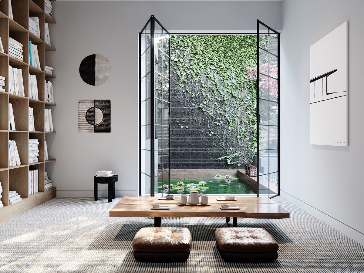 A Japanese Chabudai table and Zabuton cushions puts eye level low to delight in lilypad blooms. Connect indoor tea rooms with outdoor courtyards via steel cased bifold doors that are framed to replicate traditional Shōji doors.