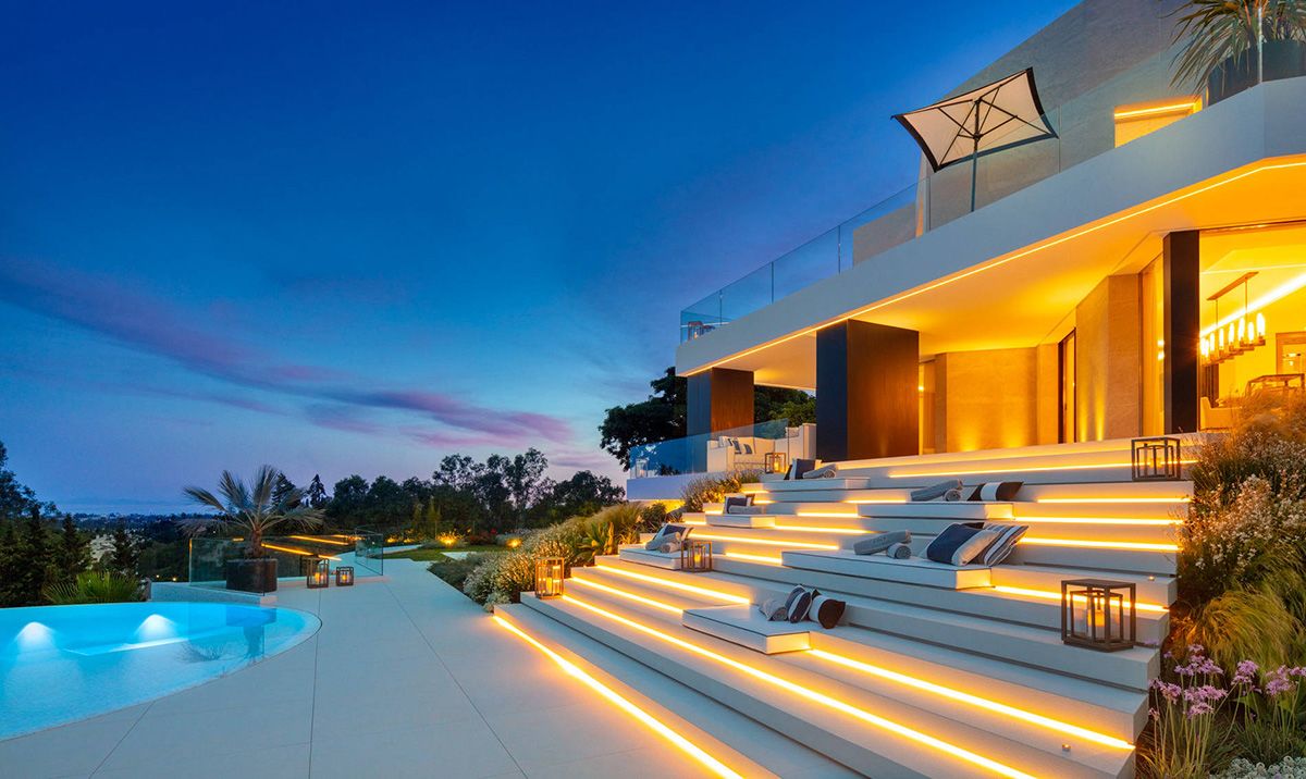 Light it up. The grand outdoor staircase of this Spanish villa comes alive under long ribbons of warm, golden LED light. The illumination instantly sets a party scene around a cascade of seating cushions that cut precisely into the treads.