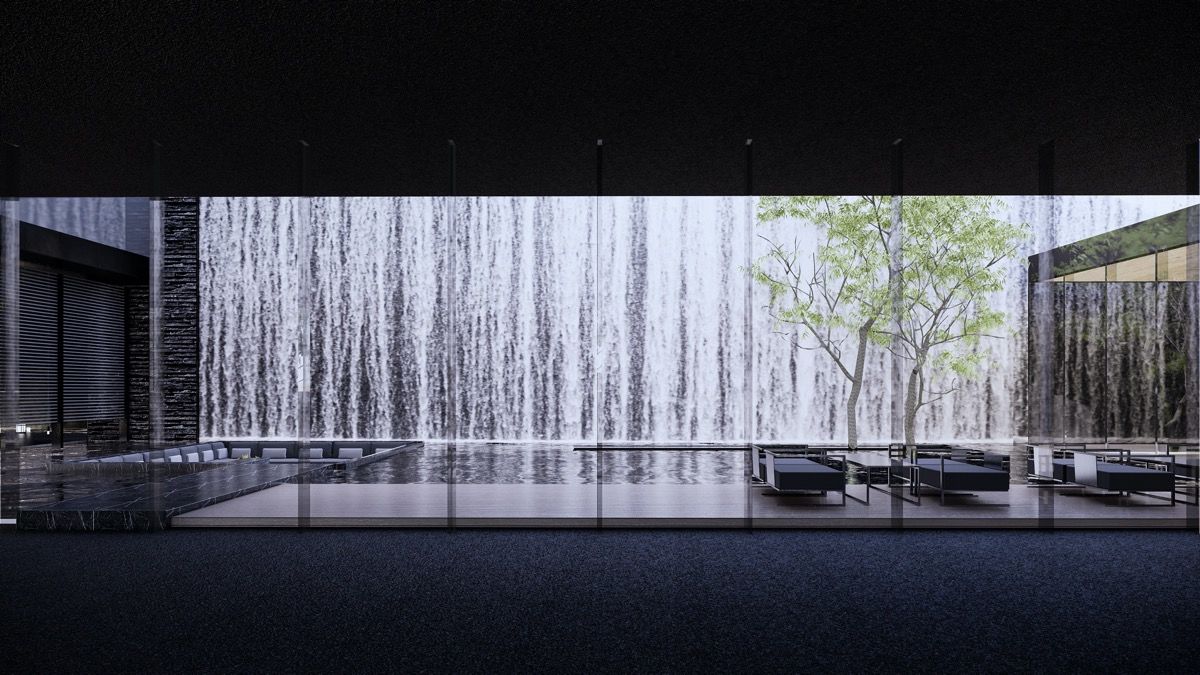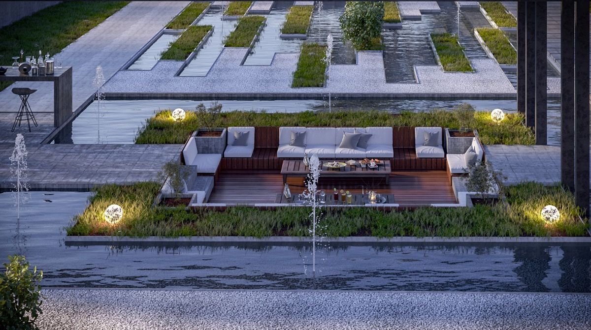 Elegant fountains create a satisfying splash around a sunken conversation pit, and in between jetties of planters that protrude into the pool.