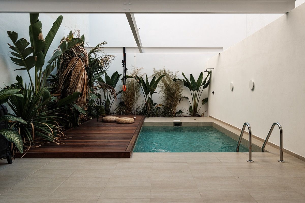The cabana and concrete built-in bench are cool, but it’s the explosion of purple climbers and potted plants that really brings this one to life.