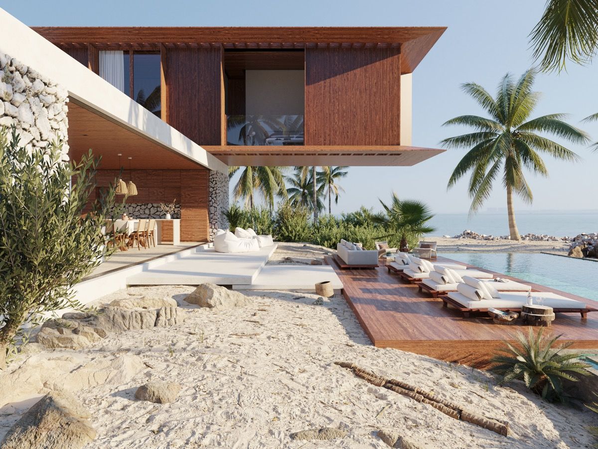 A sandy beach rushes up around the wood and white concrete deck arrangement of this coastal home design. Tiered terraces give each outdoor living area an unobscured view of the water.