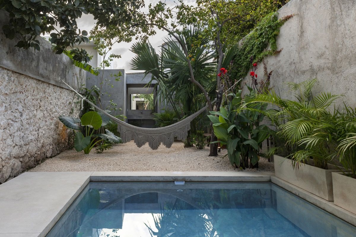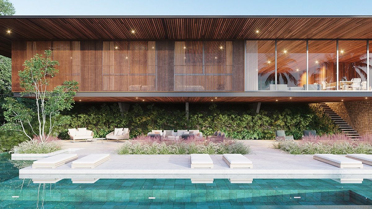 At the other side of the same pool, a hammock deck is cantilevered over the water, and two more sun loungers recline in the shallows.