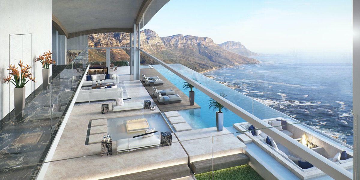 Infinity pool, infinite panorama. A rocky coastline and blue waves roll away from an enormous sun terrace with a luxuriously furnished outdoor living room, sunbathing deck, a pool fire pit, and a sunken conversation pit. Stepping stones create playful pathways.