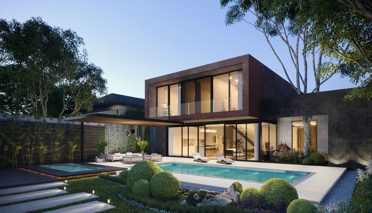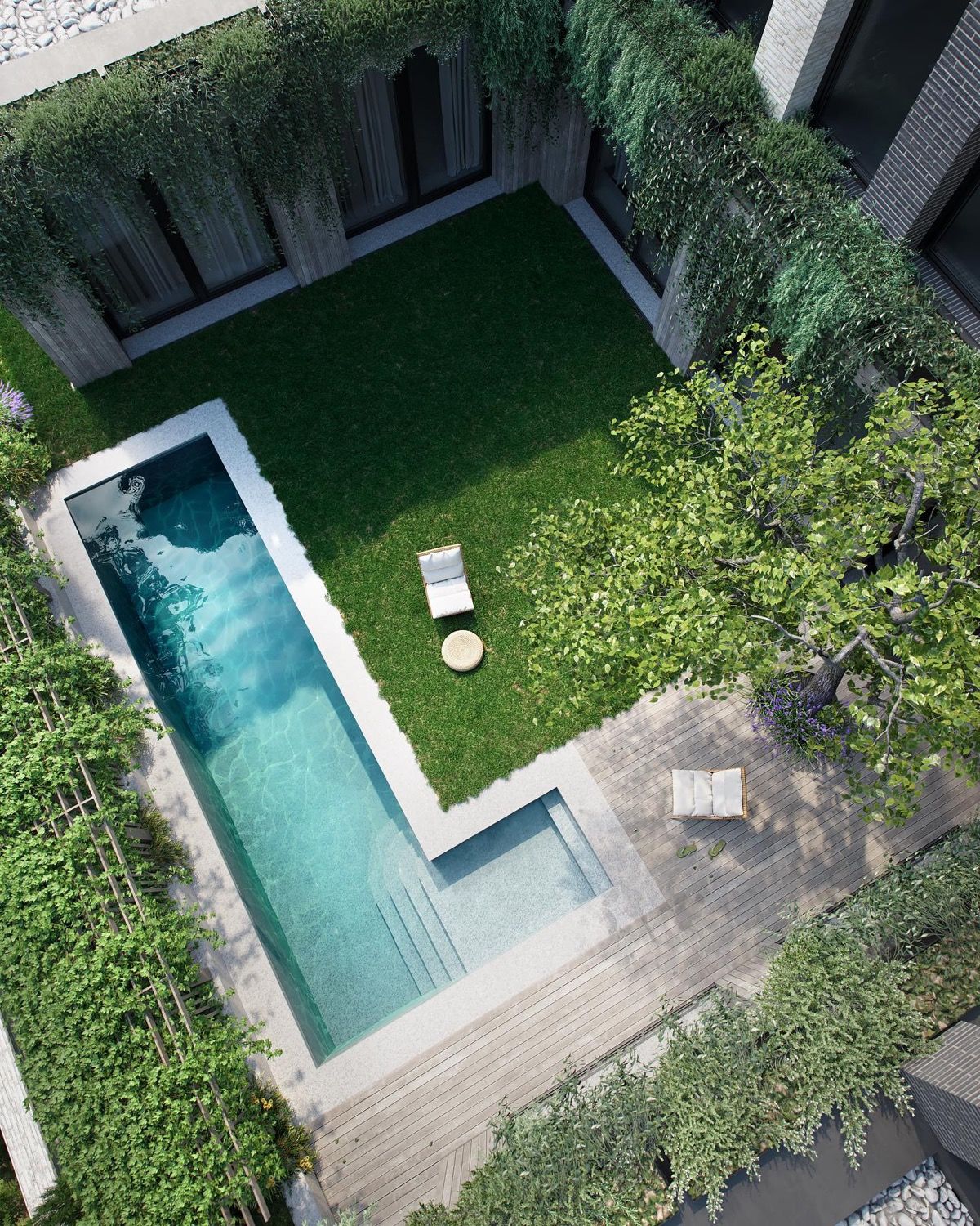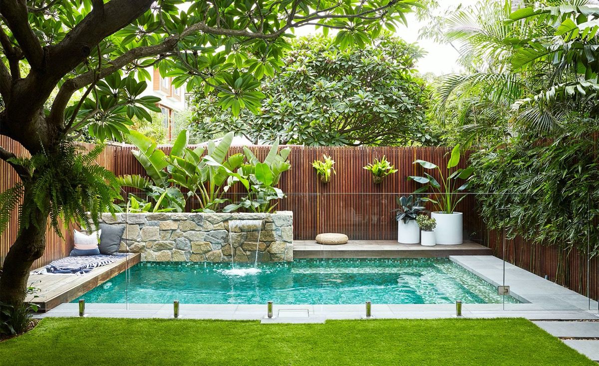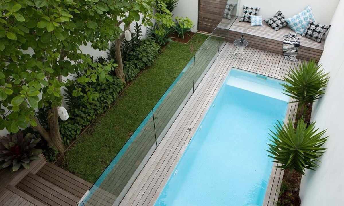 An L-shaped pool design draws a cool and calming boundary around two sides of a contained courtyard design with choices of wood decked and grassed sitting areas.