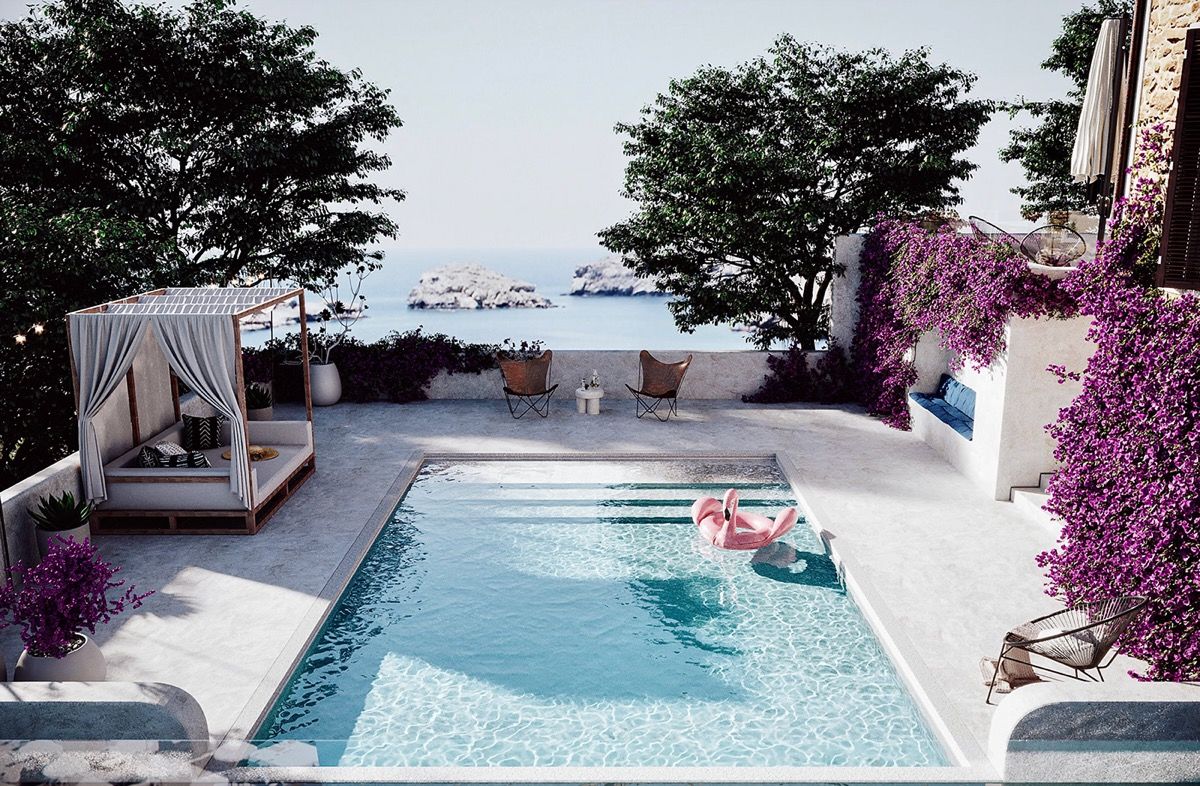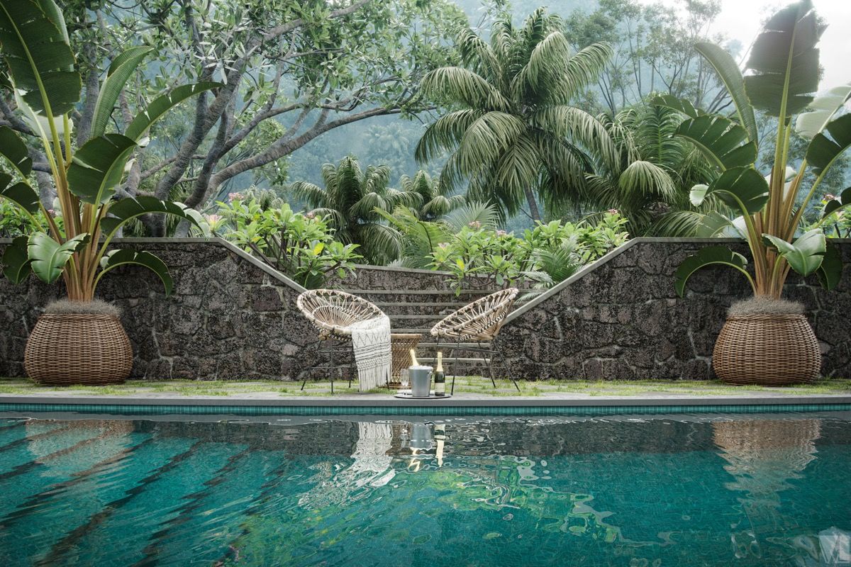 Conjure a laid-back vibe by a mini pool with rattan floor poufs.