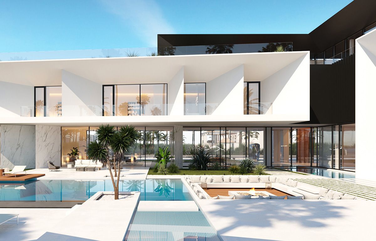 Take it all in. Pure white sectional sofas are arranged into multidirectional seating areas to take in views of the pale blue pool and tree covered landscape.