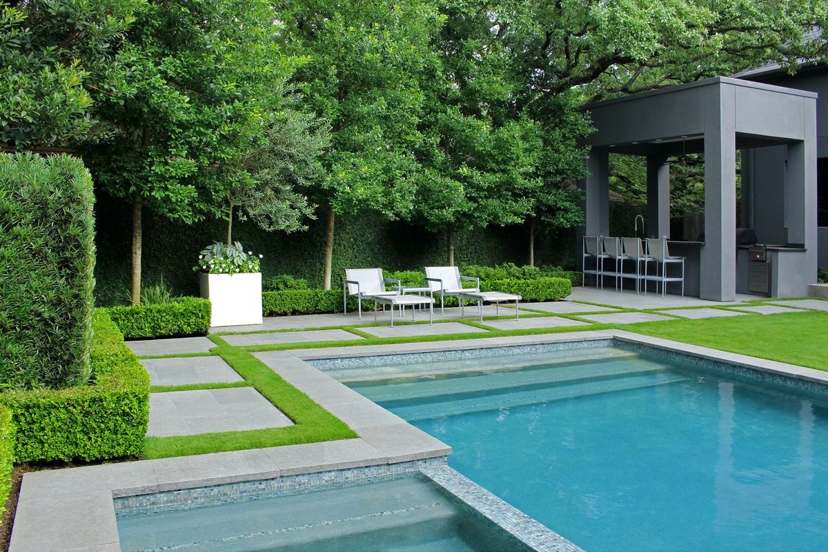 Perfectly pristine, trimmed and topiaried Boxwood borders, manicured lawns, straight marching tree lines and linear planters create a controlled sense of calm. The outdoor kitchen, however, might get a little messy at mealtimes.