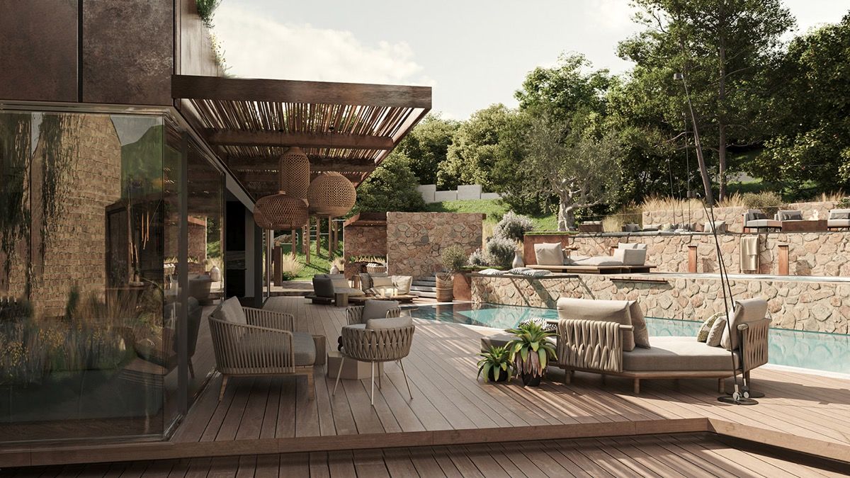 Comfortable modern outdoor chairs and sofas arrange multiple seating options around this sunny stone built poolside. Wicker pendants layer a textural arrangement under a shady canopy.