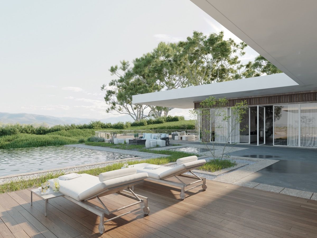 Keep it clear. An outdoor dining table area nibbles at the edge of tree shade, upon a wide open white terrace. White wireframe chairs fade from sight poolside.