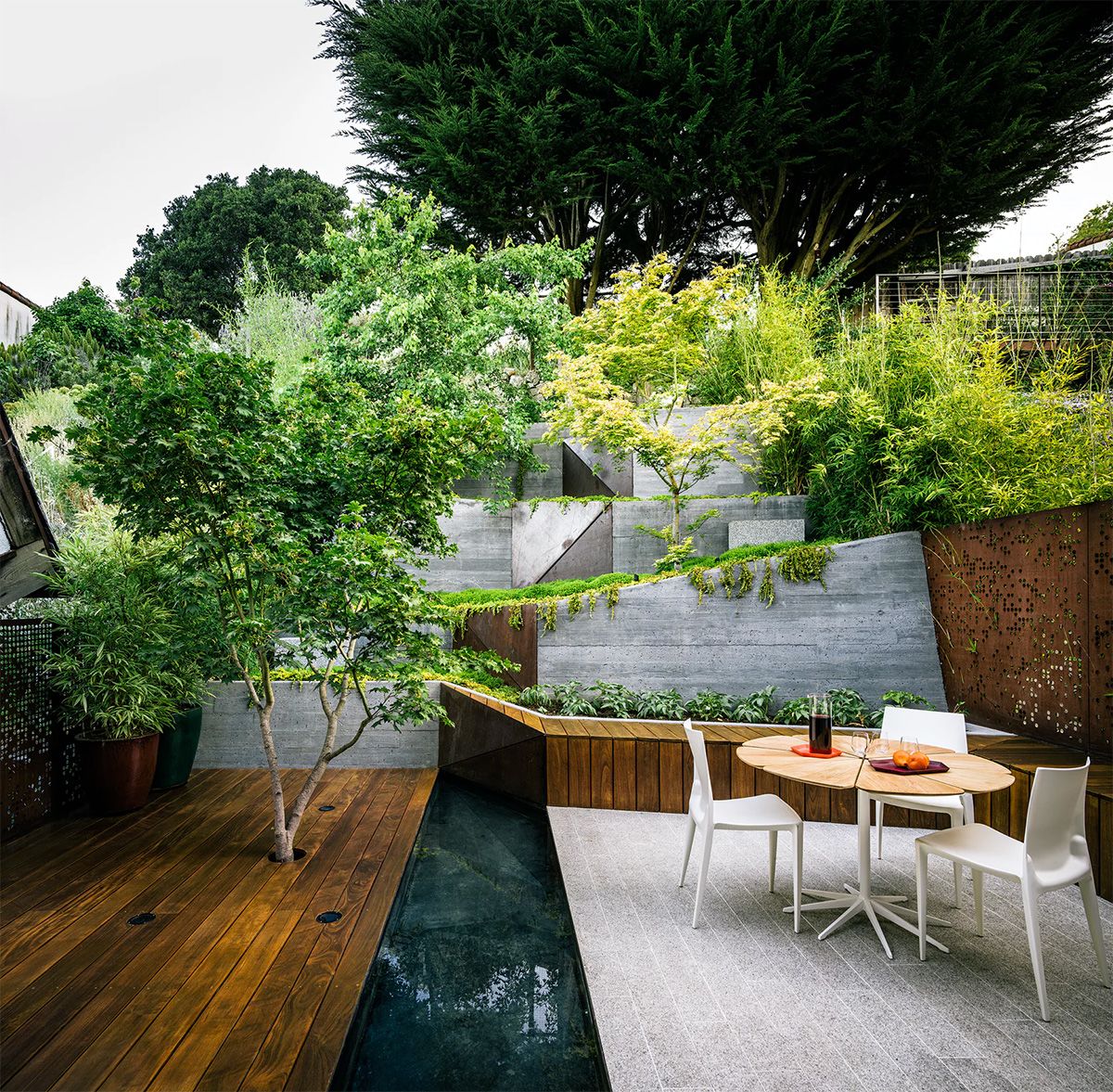 A cut above the rest. Tiered geometric planters carve modernity high into a hillside behind this pool edged patio with a unique outdoor dining table and chairs set.