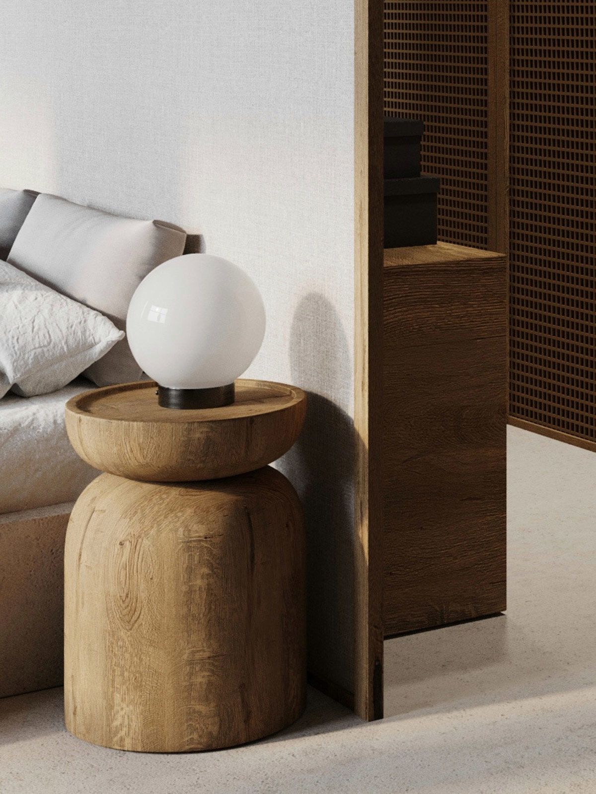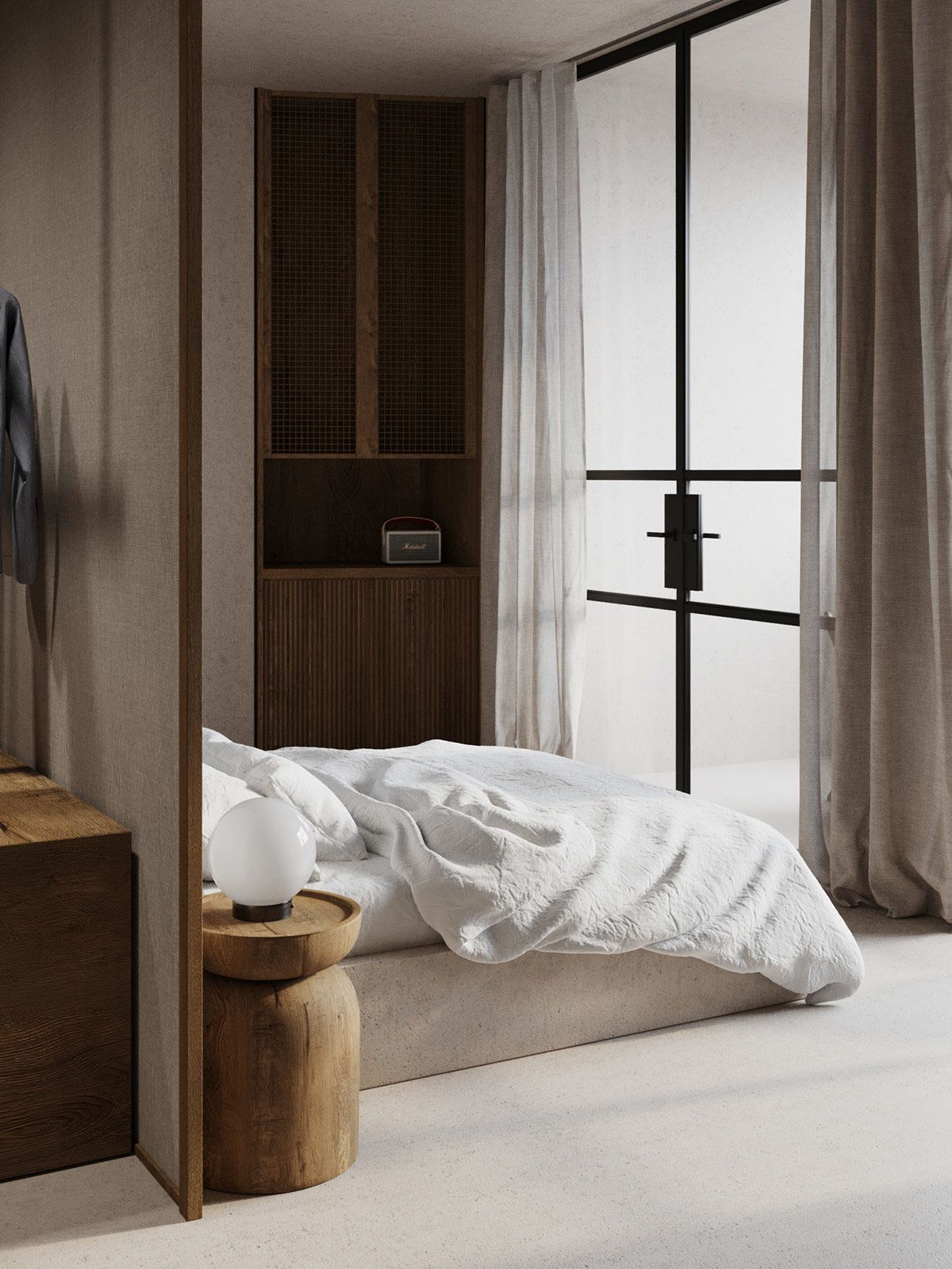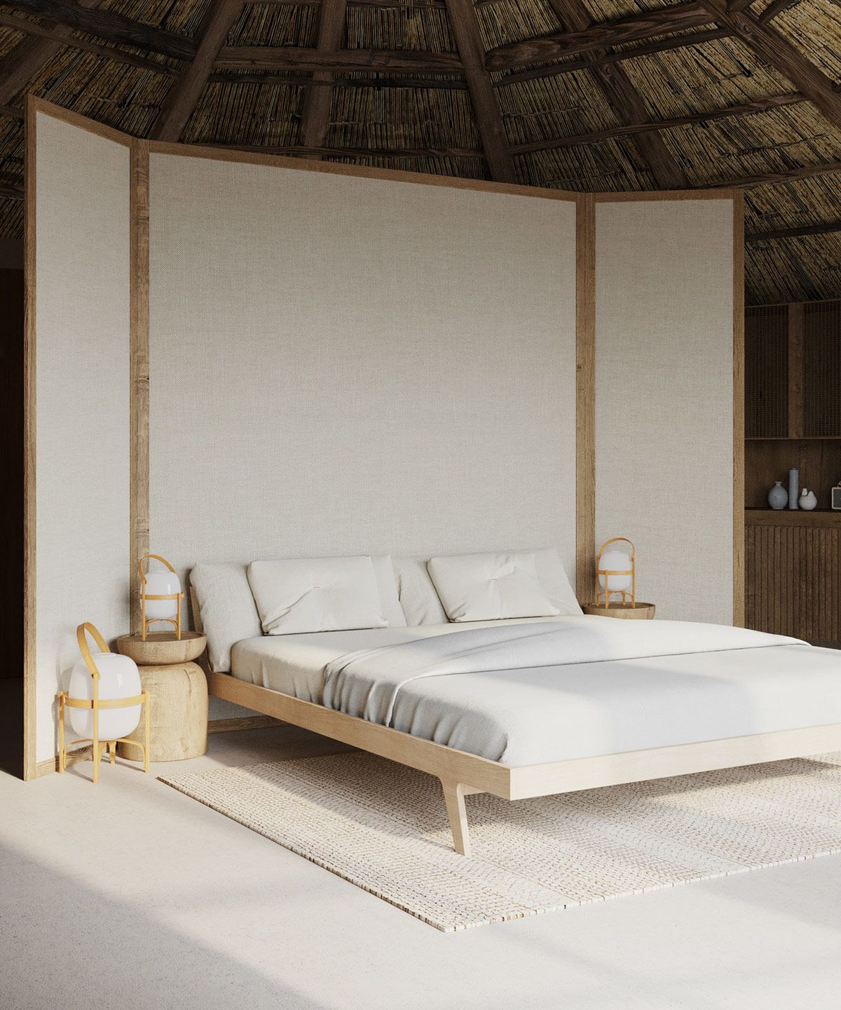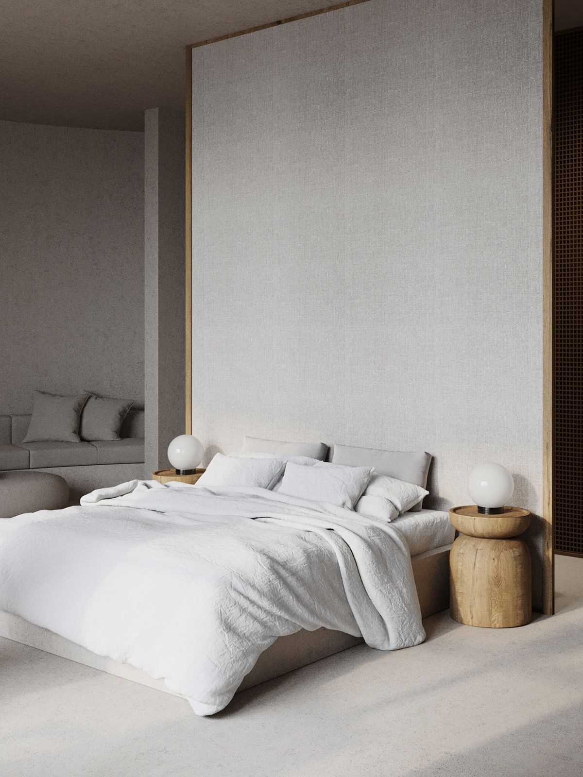 In the second bedroom, rustic bedside tables flank another headboard partition wall that separates off a dressing area.