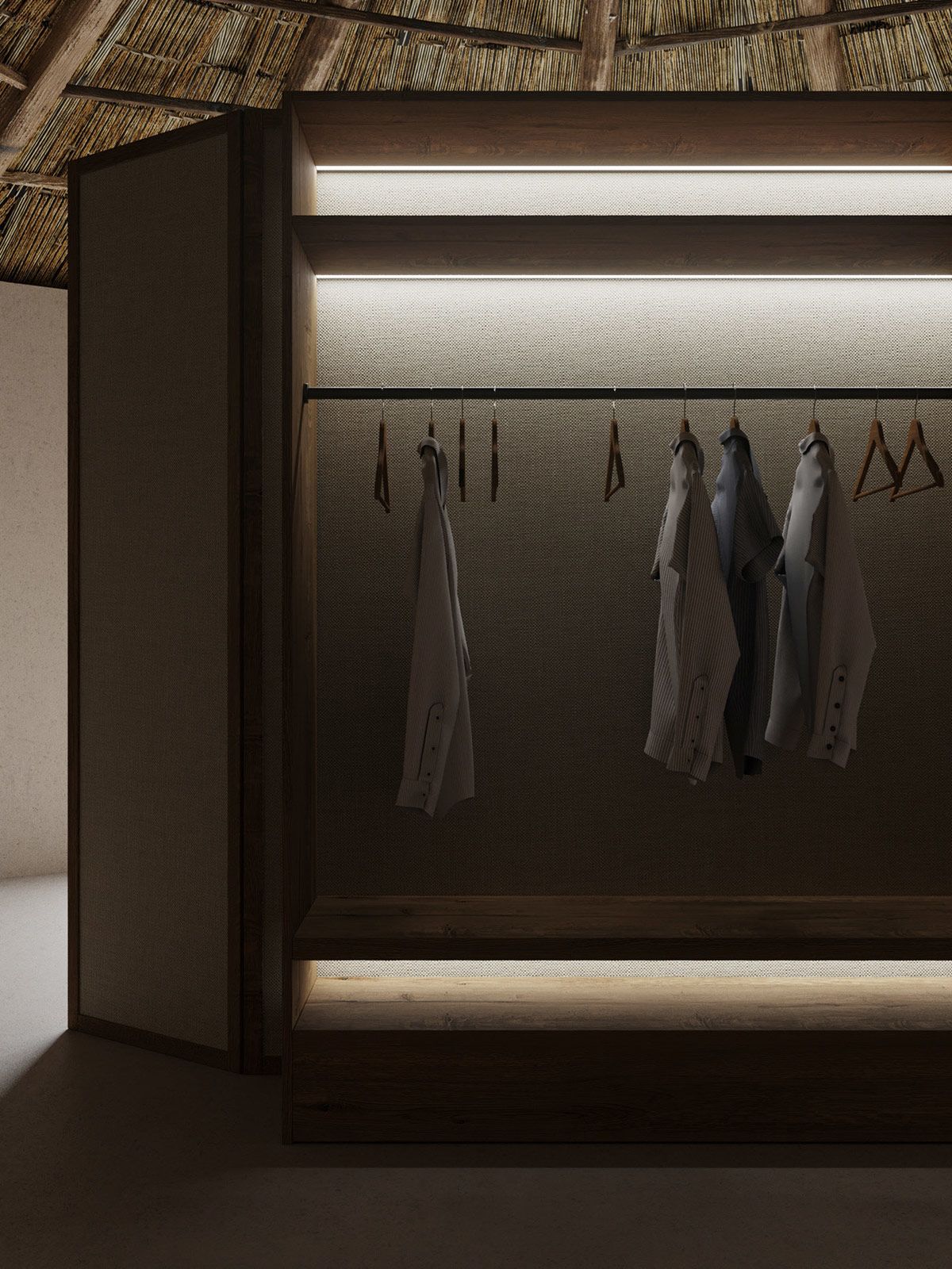 Behind the three-fold partition wall, the walk-in wardrobe is back-lit to aid the selection of garments.