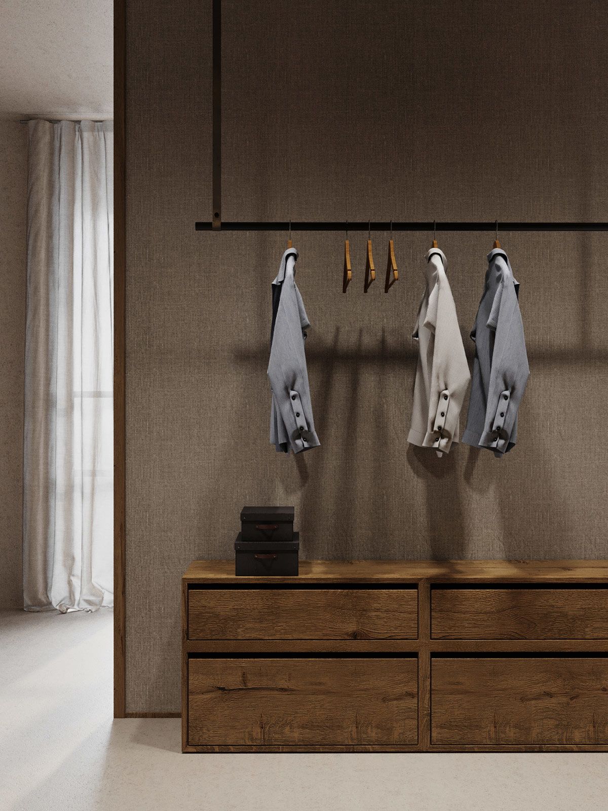 Behind the partition wall, a garment rail and a wooden chest of drawers organise clothing.