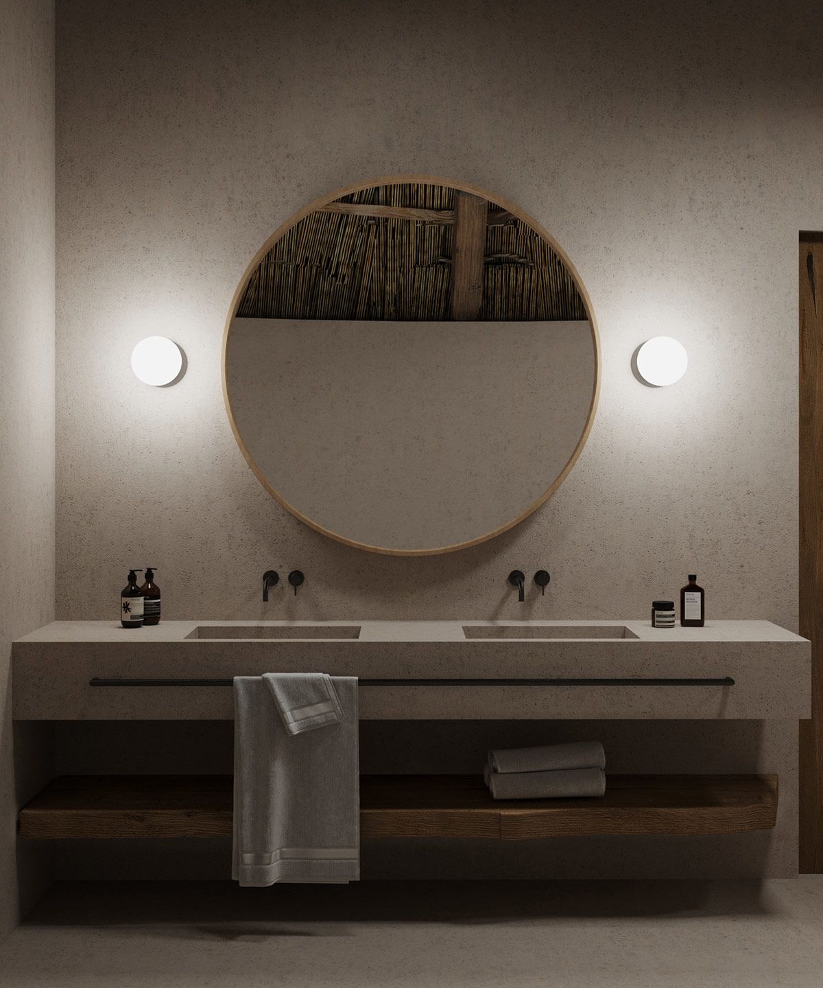 Modern bathroom vanity lights flank a large round mirror above the bespoke, linear vanity unit. A live edge wood shelf underlines the stone double sink vanity, causing a warm counteraction.