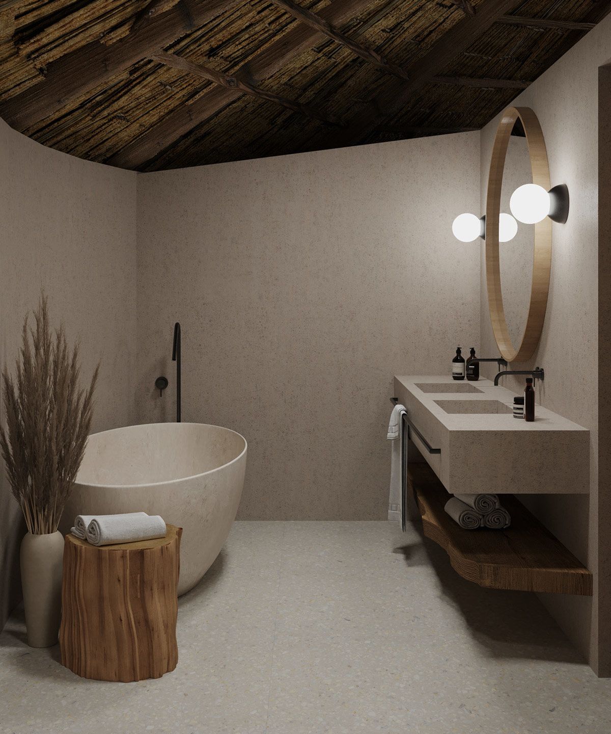 A freestanding bathtub matches lime stucco walls and a coordinated vanity unit.