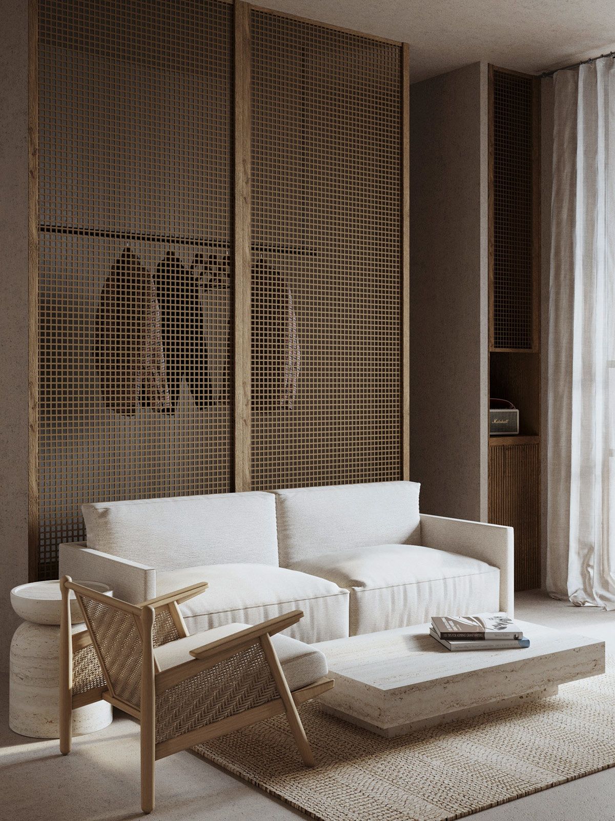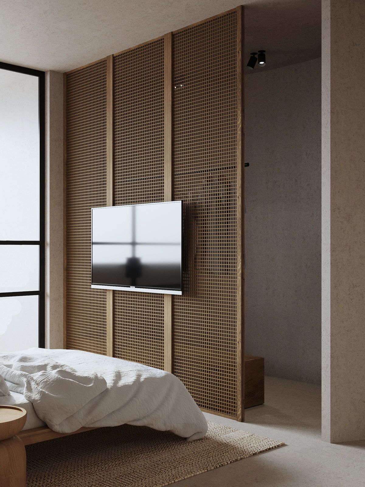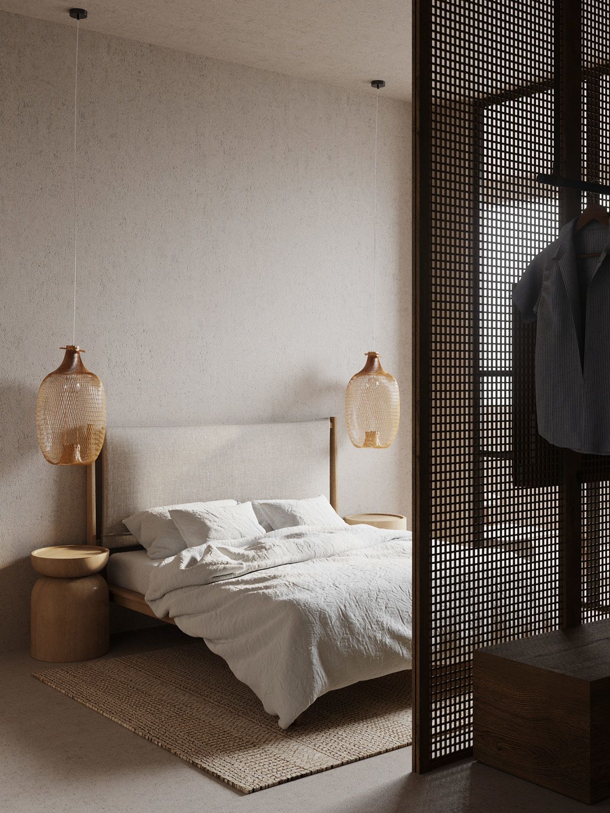 A slightly different setup is found in the third bedroom, where a walk-in wardrobe is situated at the foot of the bed behind decorative rattan screens.