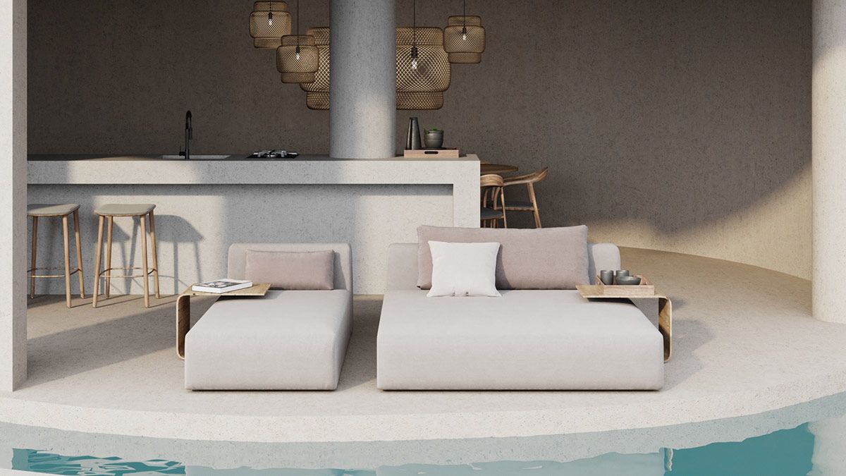 At the opposite side of the kitchen island, a modular sofa is positioned by the edge of a swimming pool, upon a wonderfully curved terrace.