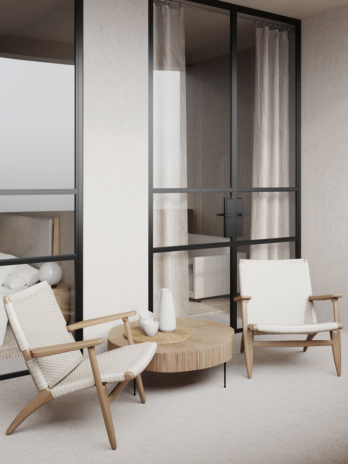A pair of lounge chairs and a wooden coffee table furnish the bedroom balcony, providing a relaxing spot in which to enjoy a light breakfast or a cup of coffee.