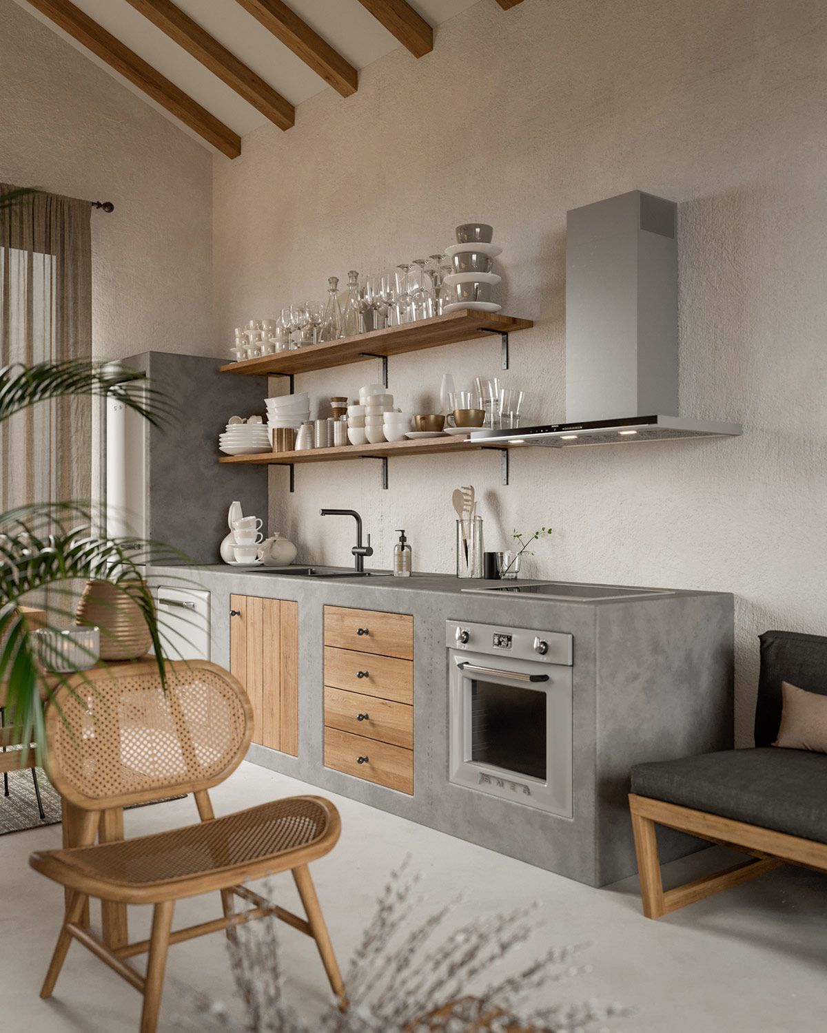 Bathroom storage cabinets are composed in the same concrete composition as the kitchen, which morphs into a concrete vanity unit at one side. A simple, black-framed vanity mirror contrasts darkly against the light wall render.