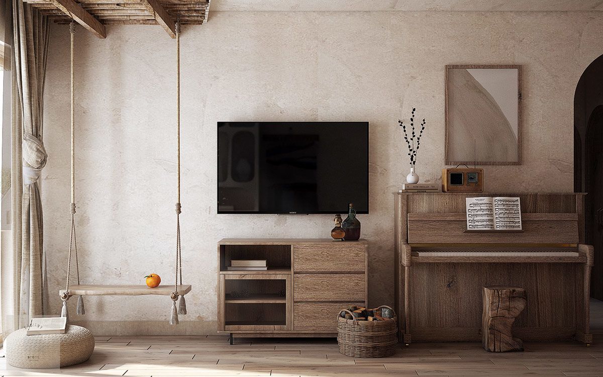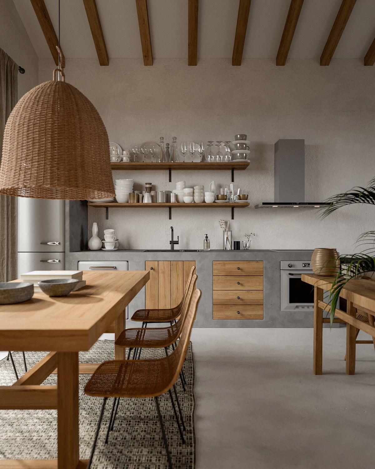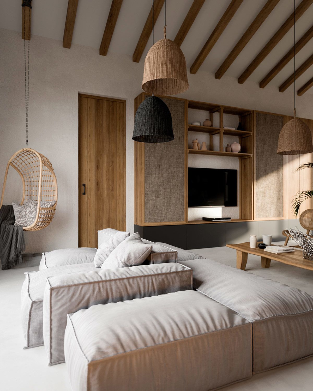 Wicker accents and wooden bowls provide moments of rustic artistry to the dwelling at every available opportunity. Indoor plants add a blast of fresh, uplifting greenery to the interior, which helps to form a connection with the tranquil nature views beyond the window panes.