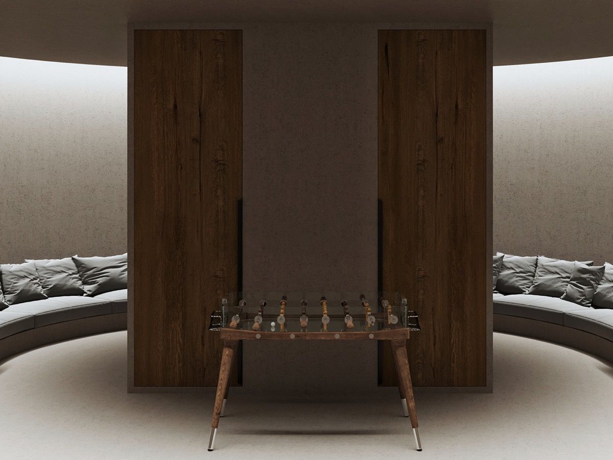 Behind the TV wall, storage units are on hand to stow away board games and consoles. A stylish foosball table completes the fun zone.