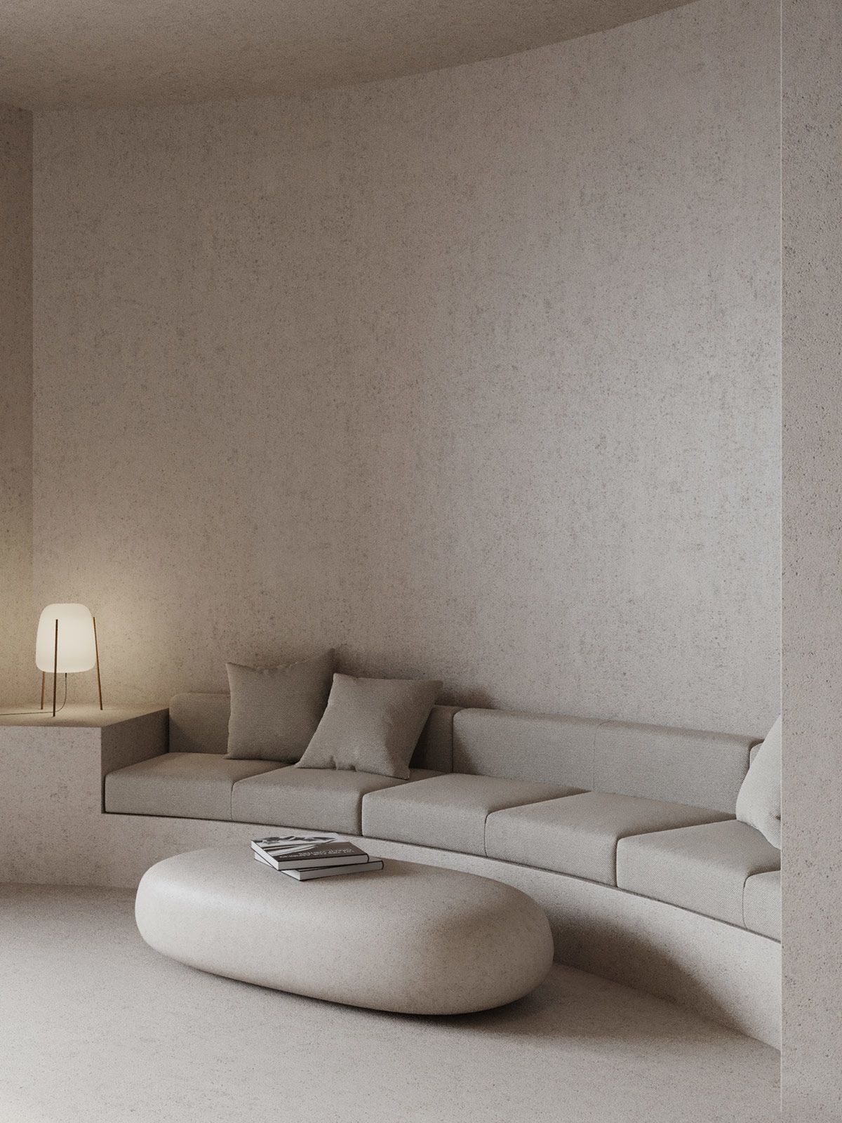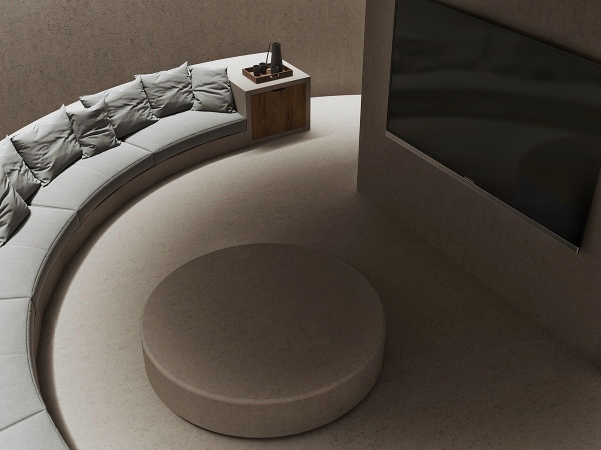 In this unique living room design, a bespoke gray sofa has been shaped to fit an extraordinary curved wall. A pebble-like modern coffee table fits into the sofa’s smooth embrace. Upholstery is perfectly shade-matched to the walls for a peaceful, understated finish.