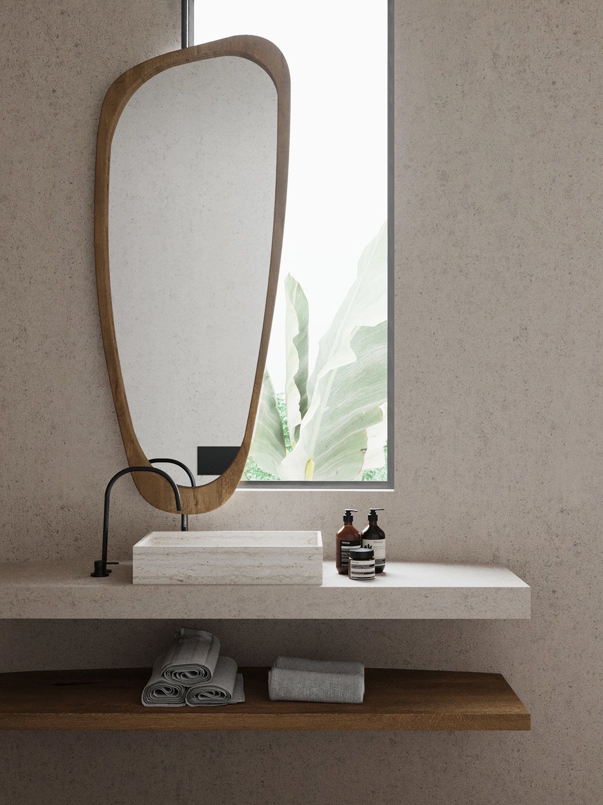 In the smaller powder room, a tall freeform mirror makes a striking companion for a small, linear stone basin.