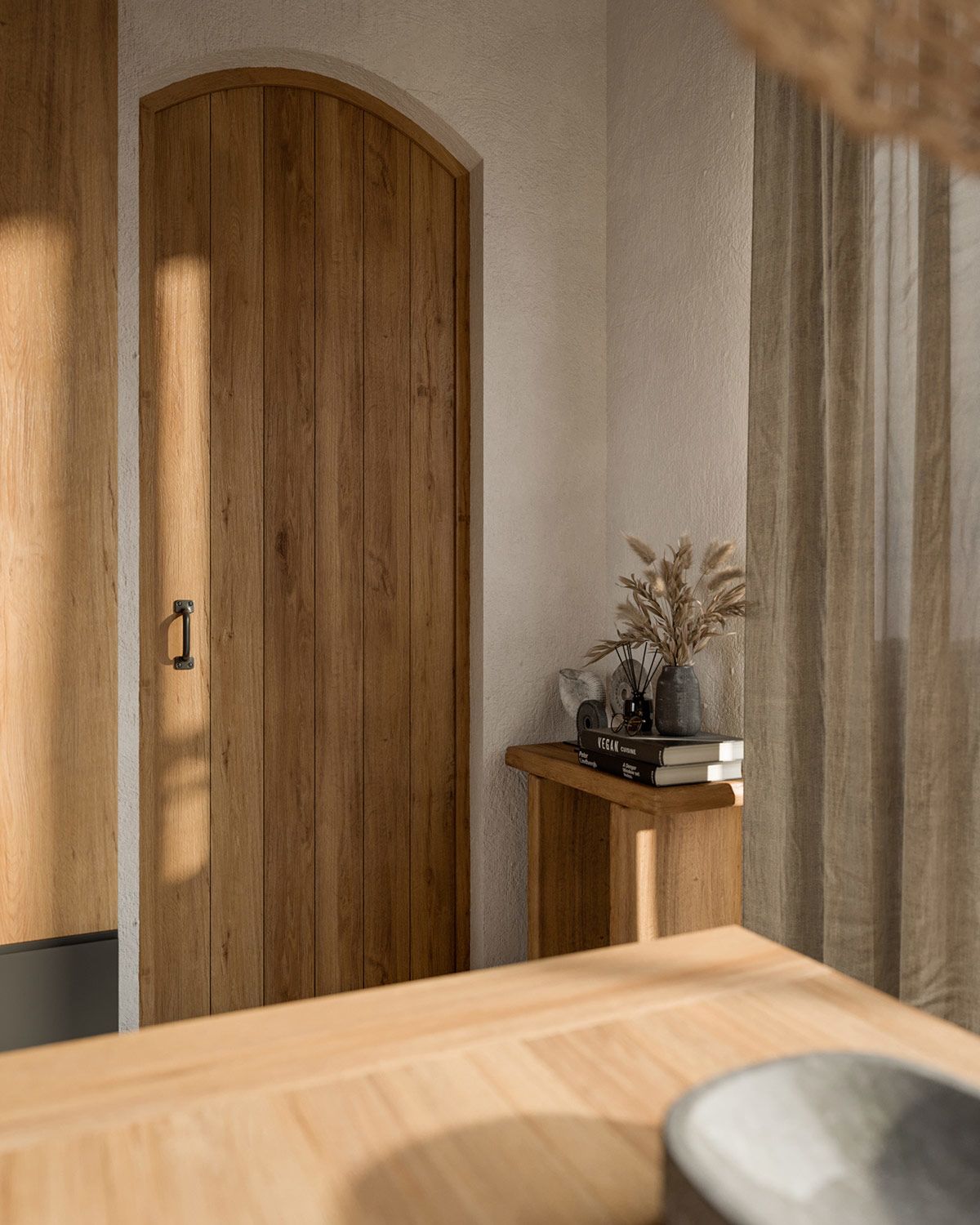 Linen curtains allow natural light to softly filter through. Sun beams fall upon a beautiful arched wooden door.