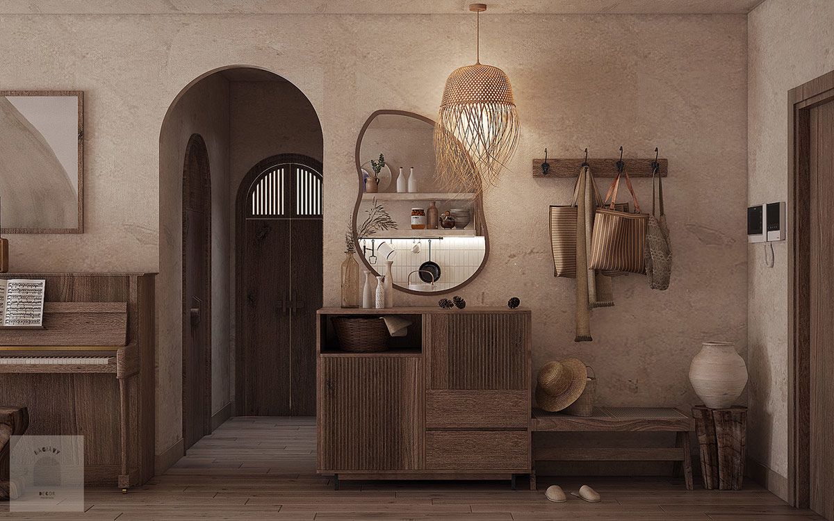 A freeform mirror echoes the fluid shapes that sculpt the unique shelving unit on the opposite side of the room. A wicker pendant light warmly illuminates the home entryway. An entryway stool and bench provide flexible pieces on which to sit and to display items.