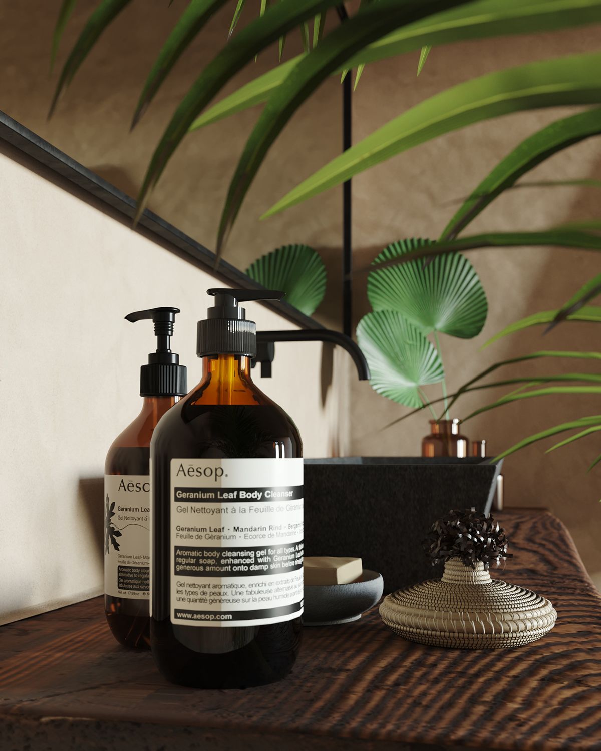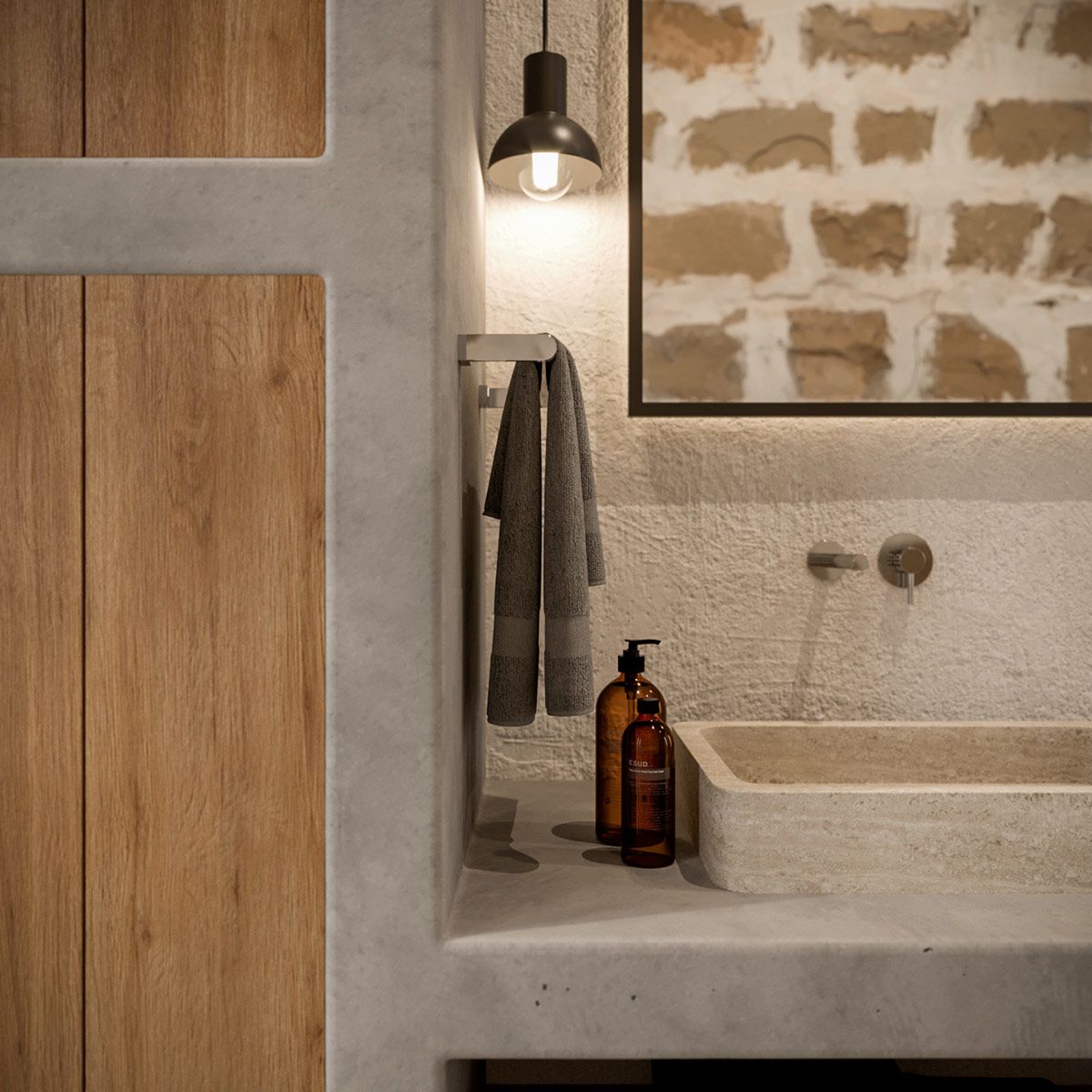 In the bathroom, amber glass vases and toiletry bottles subtly meld with a rich wooden vanity unit.