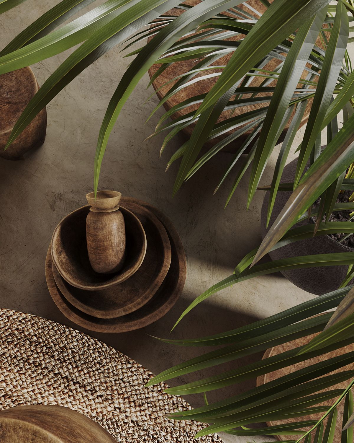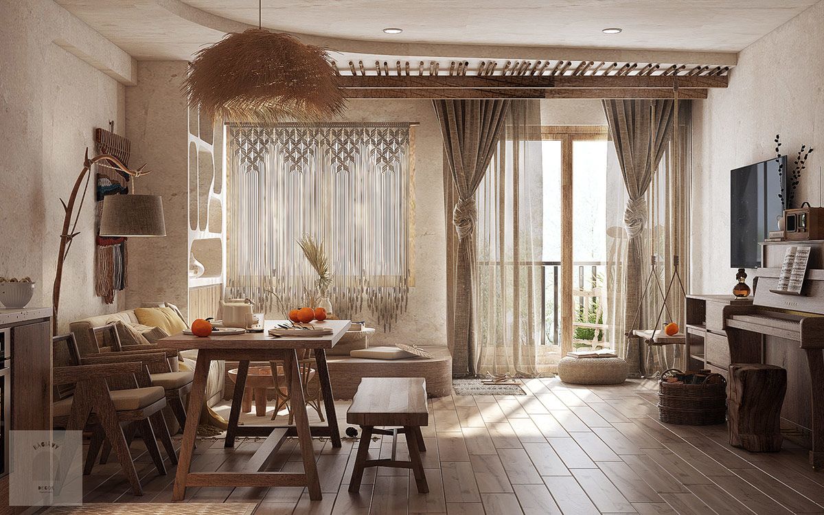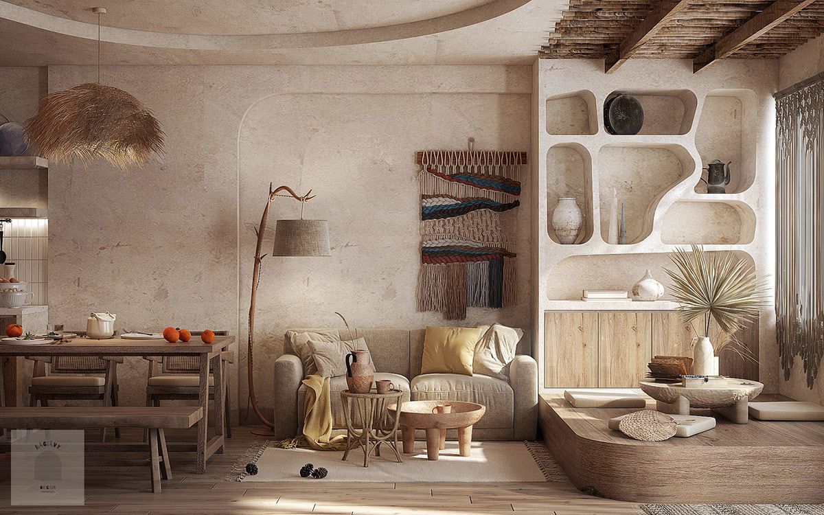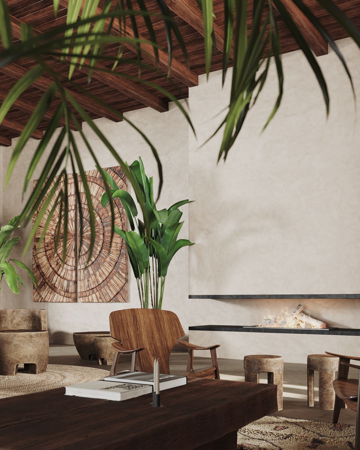 Our final home design, located in Vietnam, is personalised with a fabulous freeform shelving unit installation that merges with the lime wall stucco. A raised platform floor elevates a cosy tea room area at the food of the built-in unit. Macramé window dressings double as an eye-catching art piece.