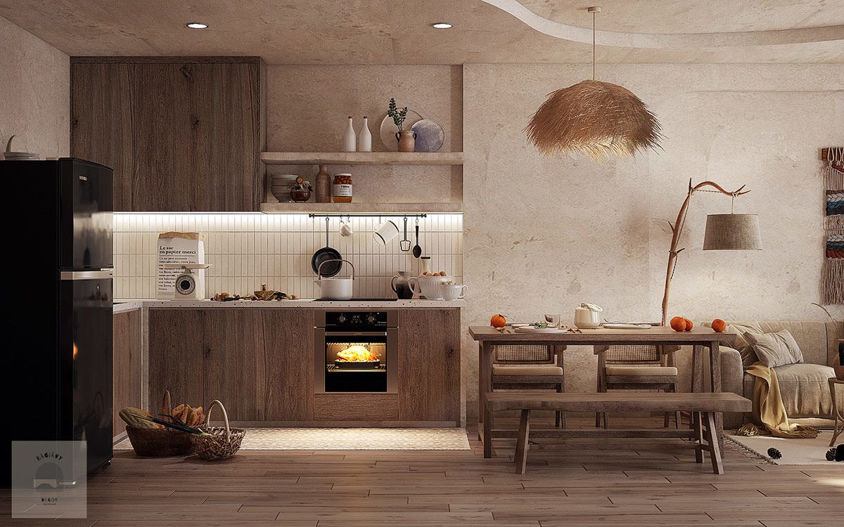 The rectangle wooden dining table fits neatly into the L-shaped kitchen layout.