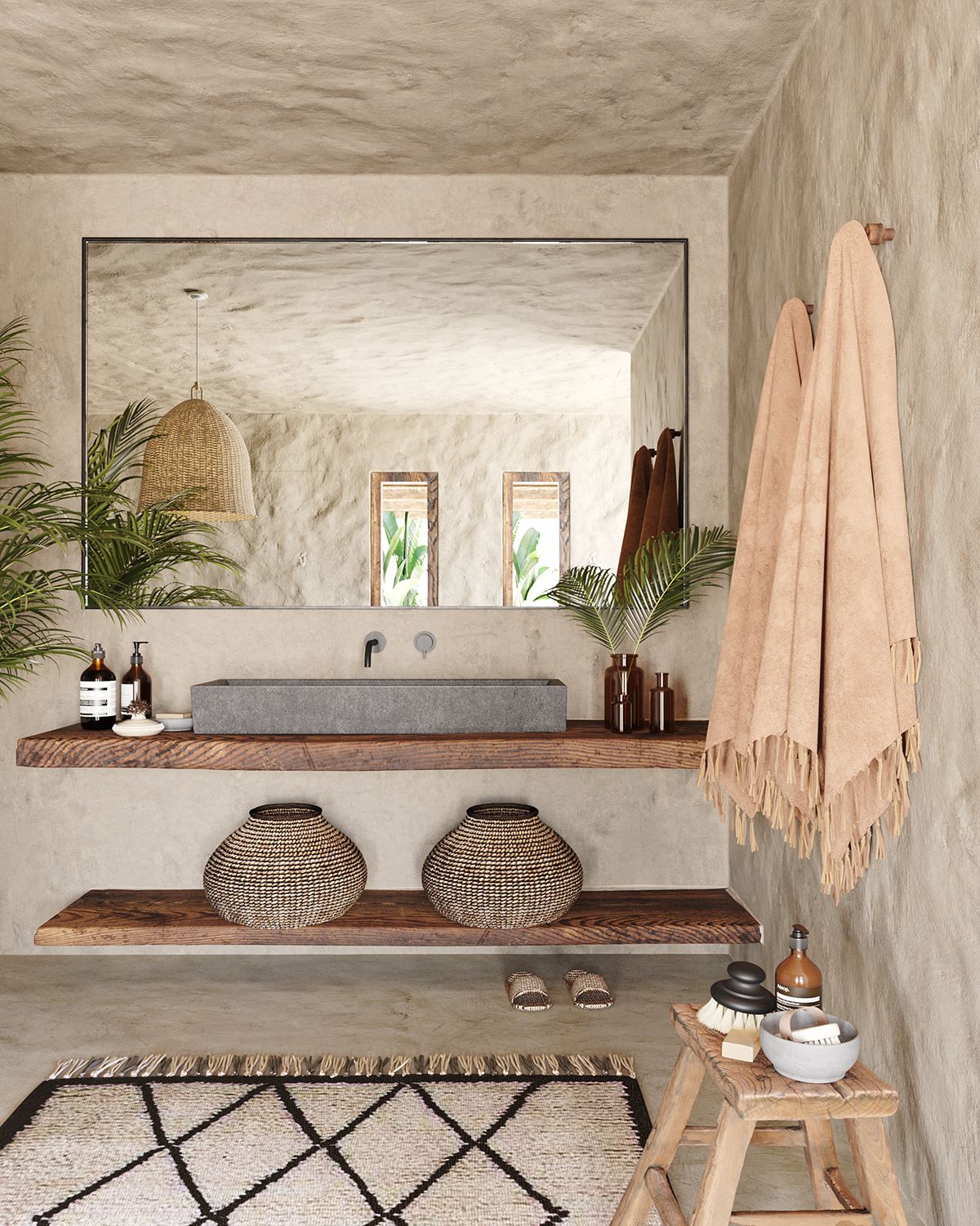 A concrete bathroom sink counteracts the natural timber vanity shelf with man made material. Wicker baskets offer a tidy and attractive storage solution under the basin, whilst a tasselled area rug softens the look of the concrete bathroom floor.