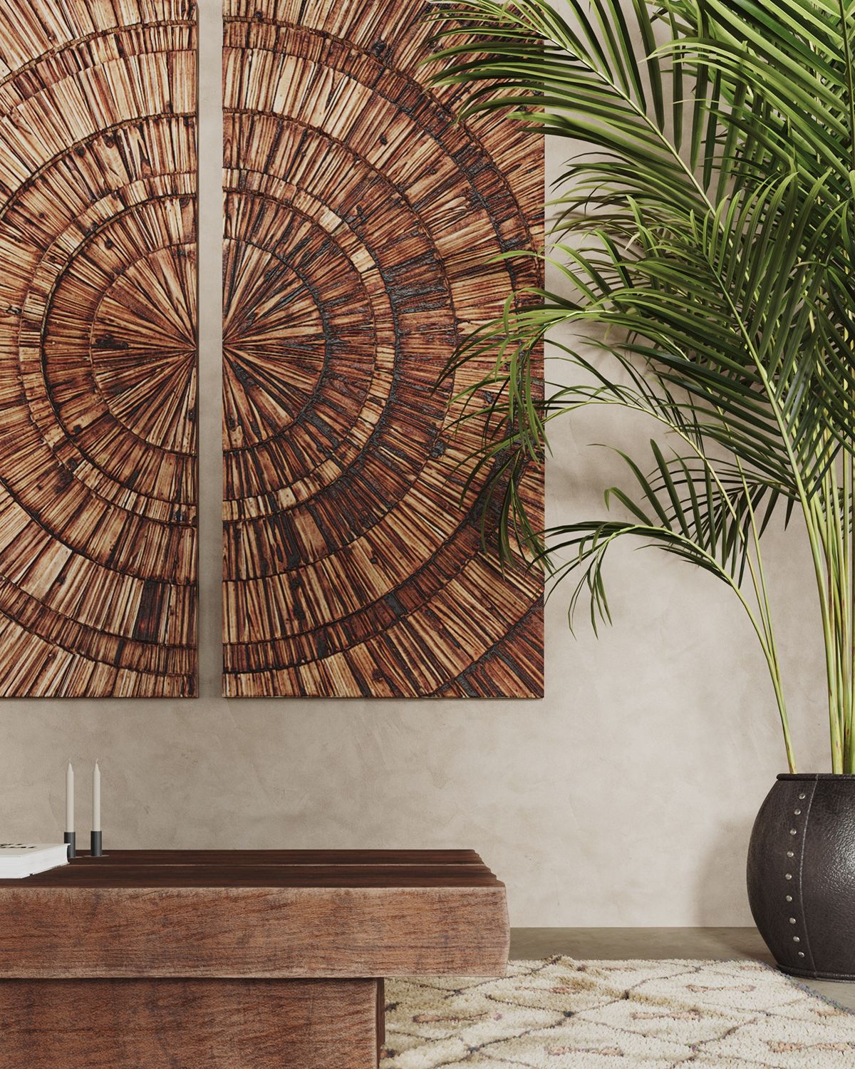 Wooden wall art in a striking diptych composition makes a stunning statement against the pale grey wall stucco.