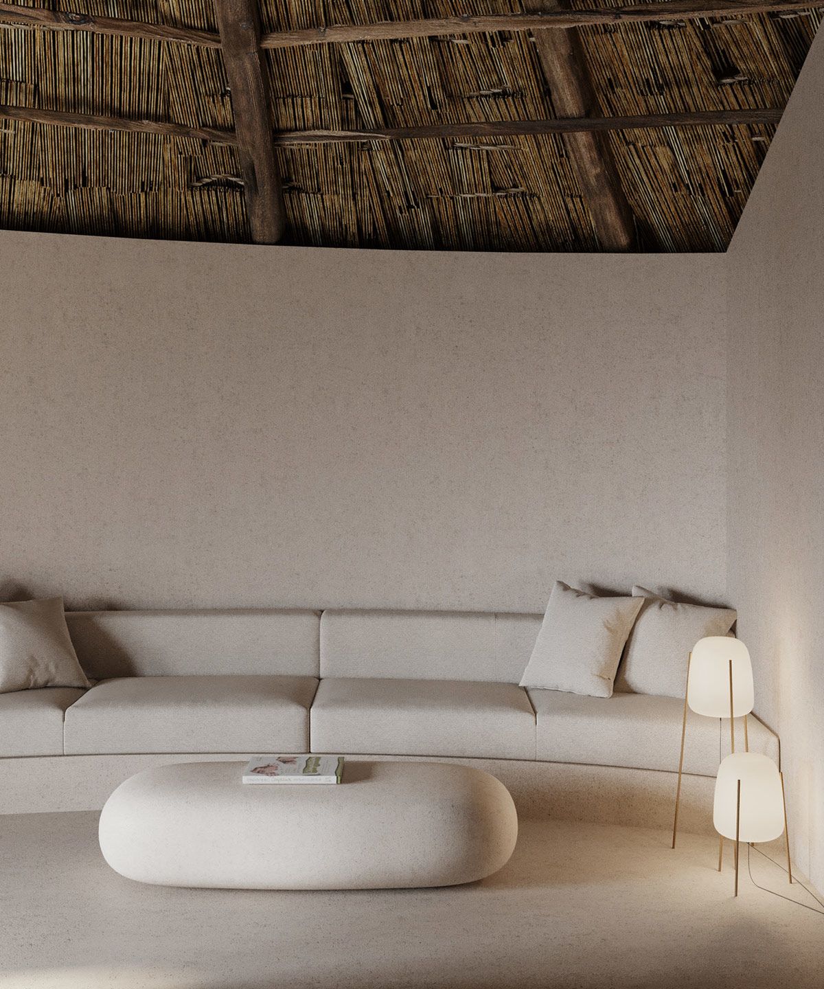A small floor lamp duo softly highlights the curvaceous nature of the living room furniture designs.