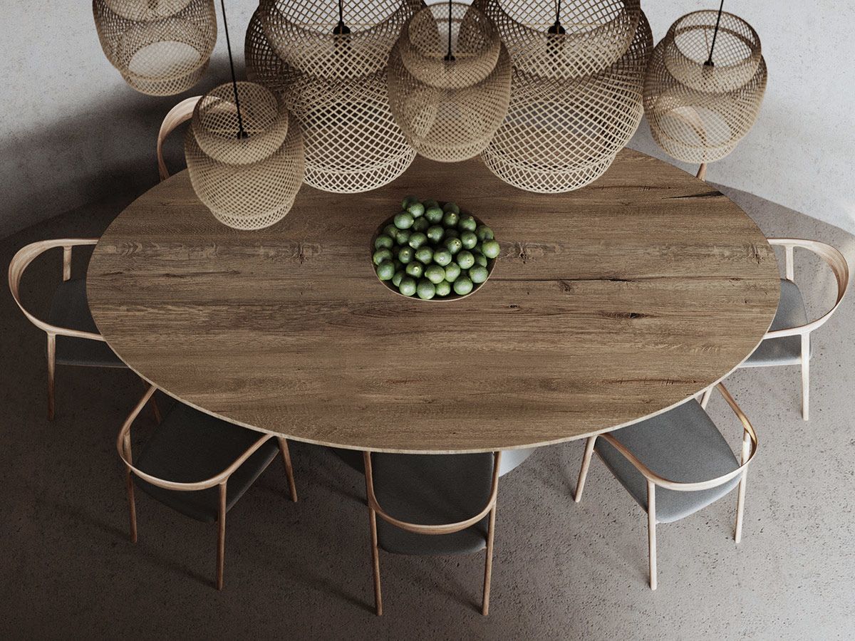 An oval dining table continues the curvaceous shape theme. Eight curved-backed wooden dining chairs encircle the wooden dining table.
