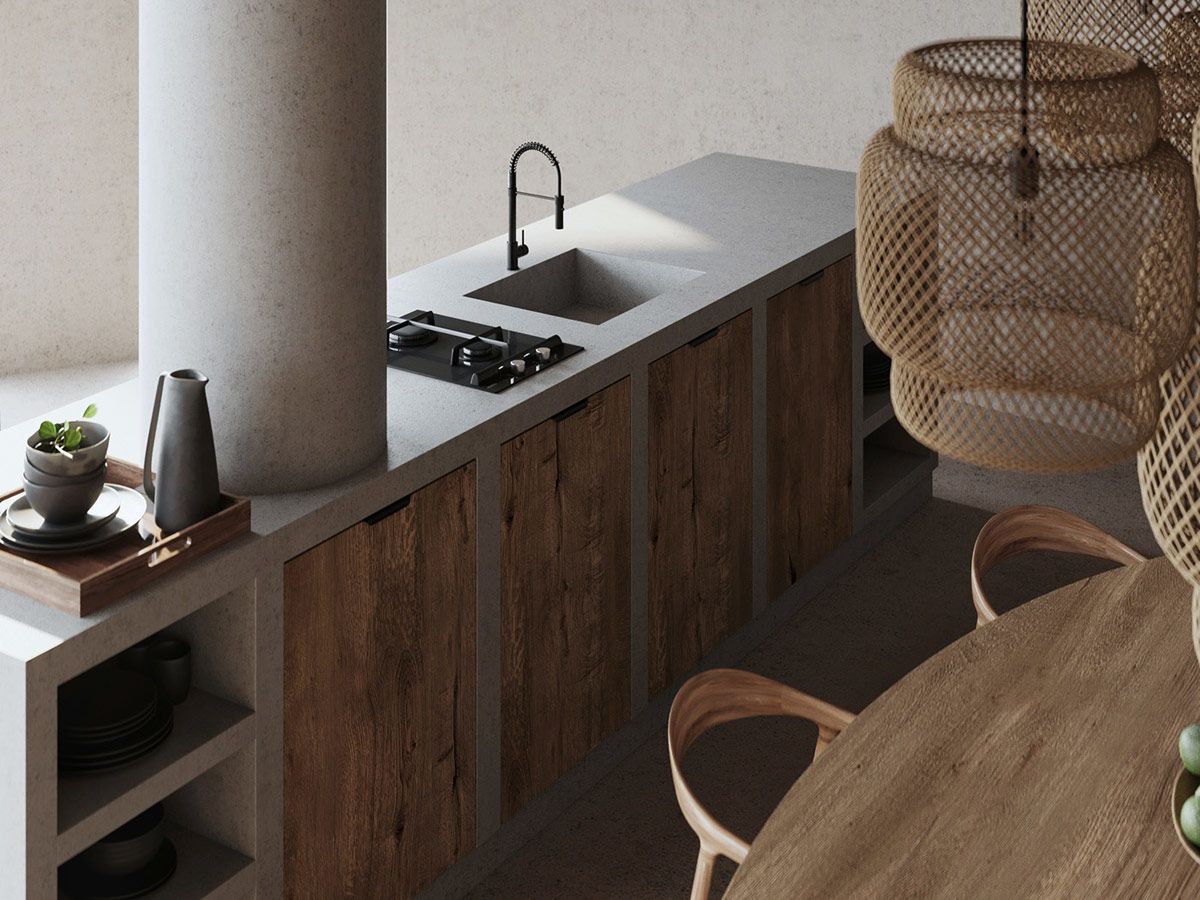 The kitchen is composed of a bespoke concrete casing, which builds an island of cabinets and an integrated worktop. Raw wooden doors front the concrete kitchen units to create a contrast of warm and cool tones.